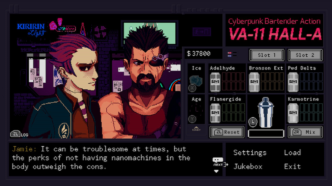 An einem unscheinbaren Fleck in der Innenstadt von Glitch City finden wir eine kleine Bar namens VA-11 Hall-A, zur Vereinfachung Valhalla genannt. Im Rahmen des Spiels stecken wir in den Schuhen von Jill Stingray, die an der Theke der kleinen, bescheidenen und bequemen Bar arbeitet und folgen ihrem Alltag für einen knappen Monat. Da Jill so ziemlich tagein, tagaus in Valhalla hinter dem Tresen steht, könnte man erwarten, dass sich hier nicht wirklich viel abspielt. Doch mit Chefin Dana und Kollege Gillian trifft man in der Schänke auf viele durstige Seelen, die auch genug Gesprächsstoff mit sich bringen.