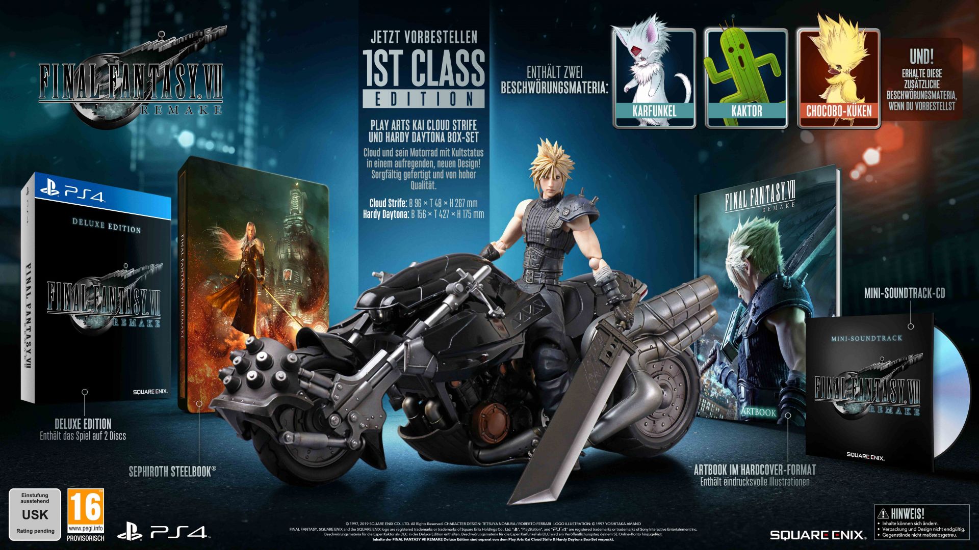 Die „1st Class Edition“ bietet alle Inhalte der Deluxe Edition, die Beschwörungsmateria für die Esper Karfunkel als DLC sowie ein Play Arts Kai Cloud Strife und Hardy Daytona Box-Set (separat verpackt). Diese Edition ist in begrenzter Stückzahl zur Vorbestellung ausschließlich im Square Enix Online Store verfügbar.