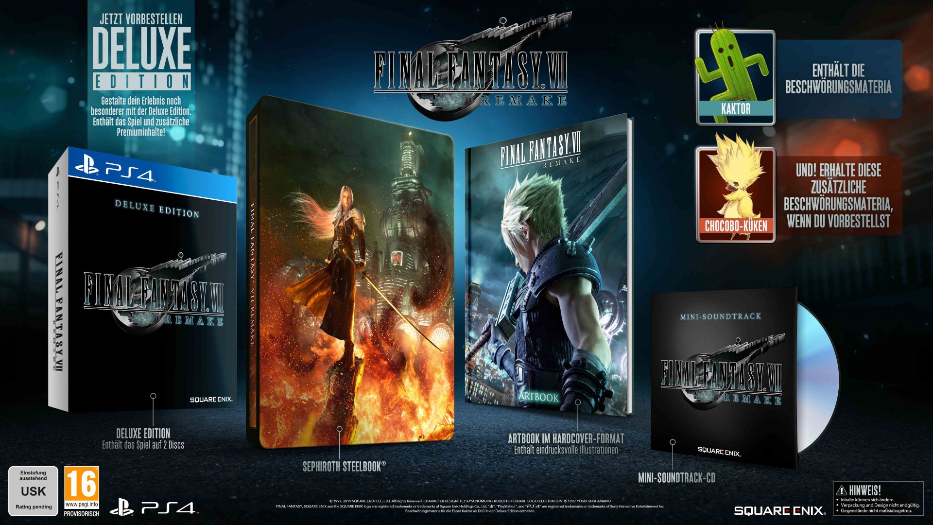 Die Deluxe Edition beinhaltet ein Hardcover-Artbook mit atemberaubender Konzeptkunst, einen Mini-Soundtrack, die Beschwörungsmateria für die Esper Kaktor im Spiel als DLC und ein Sephiroth-Steelbook. Die Digital Deluxe Edition beinhaltet ein digitales Artbook, einen digitalen Mini-Soundtrack und die Beschwörungsmateria für die Esper Karfunkel und Kaktor im Spiel als DLC.