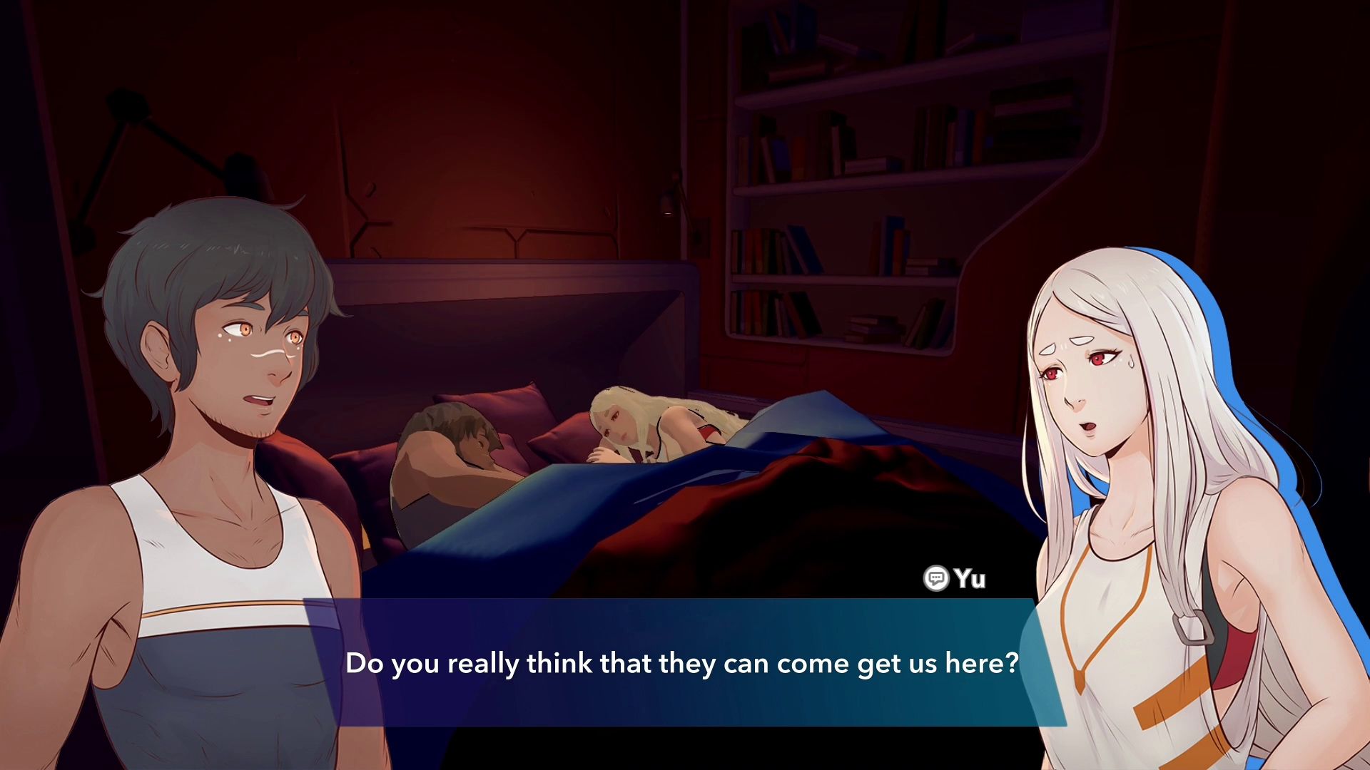 Die Beziehung zwischen Yu und Kay wird eine tragende Rolle im Spiel einnehmen. So haben wir zum Beispiel die Möglichkeit diverse Antworten in Dialogen von Yu und Kay selbst zu bestimmen, was sich anschließend auf nachfolgende Dialoge oder Situationen auswirkt. Die Dialoge waren übrigens komplett vertont, was an sich auch nicht immer üblich ist für kleinere Indie-Studios. Die Demo startet mit einigen Szenen und Dialogen. Das Paar befindet sich in einem scheinbar nicht mehr flugtüchtigen Raumschiff, das zur Basis erklärt wurde. Hier beginnt unsere Geschichte.