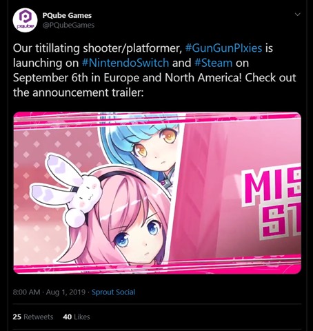 Bereits Anfang August hatte der Entwickler und Publisher PQube den 6. September 2019 als Erscheinungsdatum für Gun Gun Pixies bekanntgegeben, den Tweet aus bisher unbekannten Gründen jedoch kurz danach wieder gelöscht. Nun bestätigte PQube erneut den 6. September 2019 als offizielles Erscheinungsdatum für Nintendo-Switch- und PC-Versionen von Gun Gun Pixies.