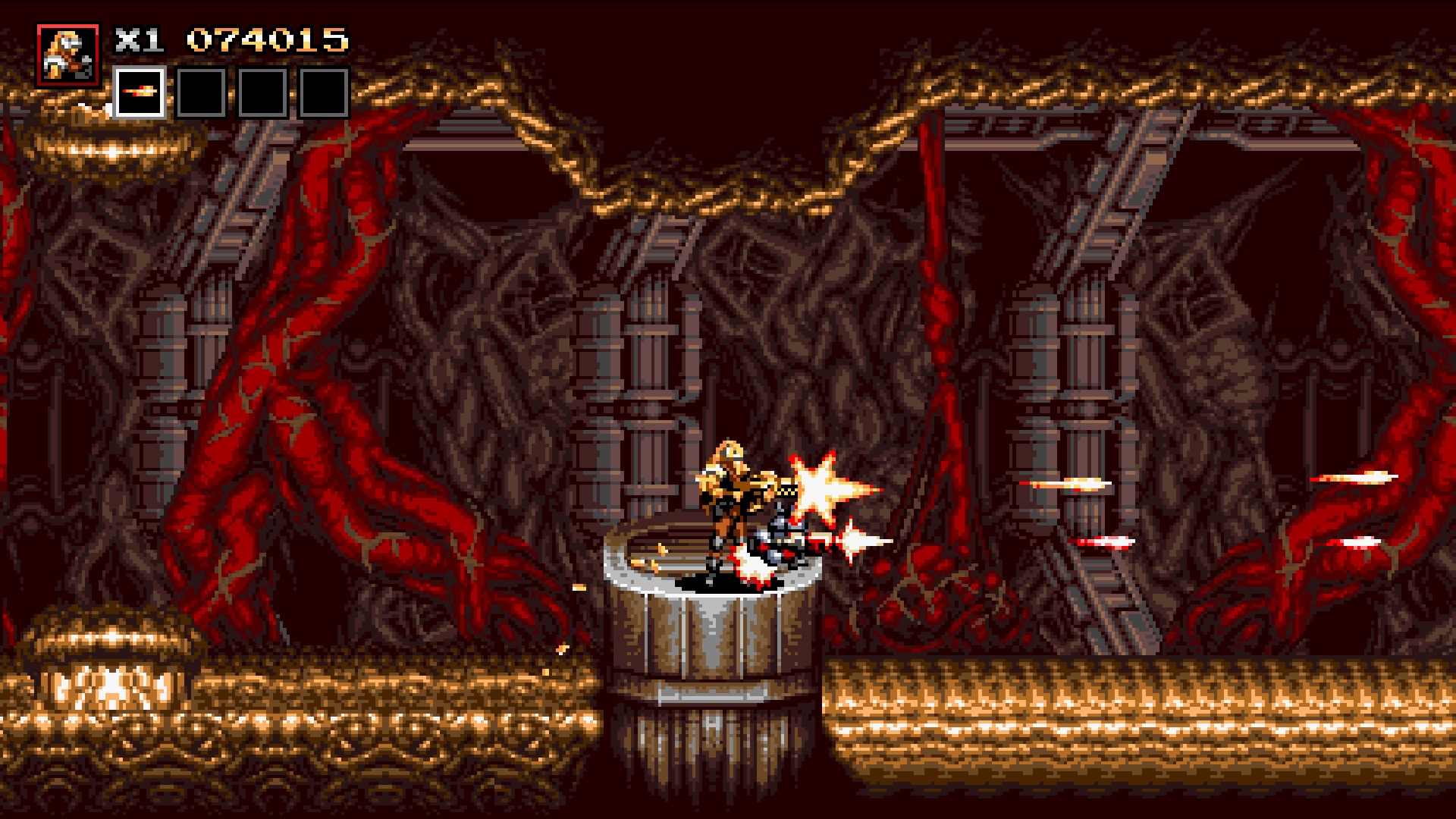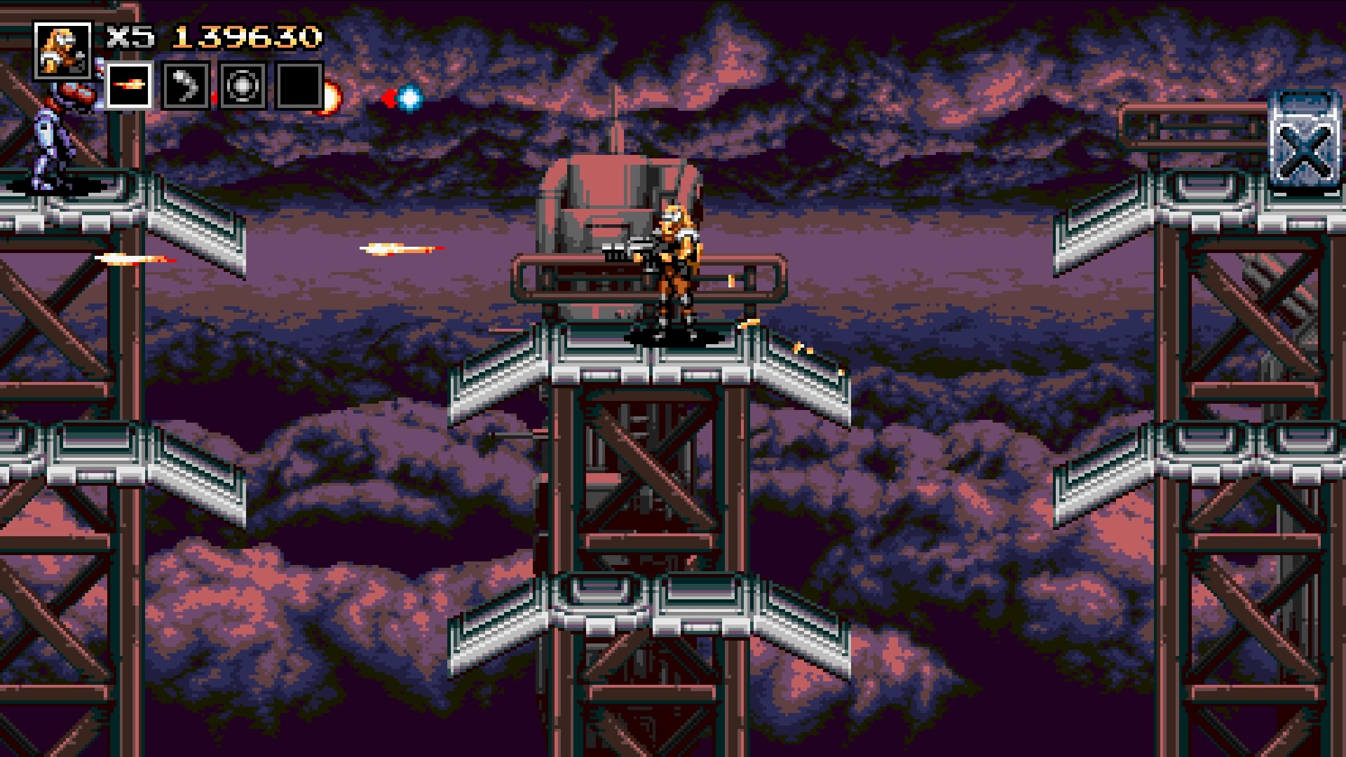 Blazing Chrome ist ein klassischer Run-&-Gun-Shooter, der verschiedene Elemente des Genres in sich vereint. Es stehen euch drei Schwierigkeitsgrade zur Verfügung, wobei der Hardcore-Modus erst nach Absolvierung des normalen Schwierigkeitsgrades freigeschaltet wird. Je nach Modus besitzt ihr unterschiedlich viele Leben und Waffenboni. Je höher der Schwierigkeitsgrad, desto weniger lebenserhaltende Möglichkeiten werden euch zur Verfügung gestellt. Zwischen den Kapiteln kann der Fortschritt gespeichert werden, was dem Ganzen etwas die Härte nimmt.