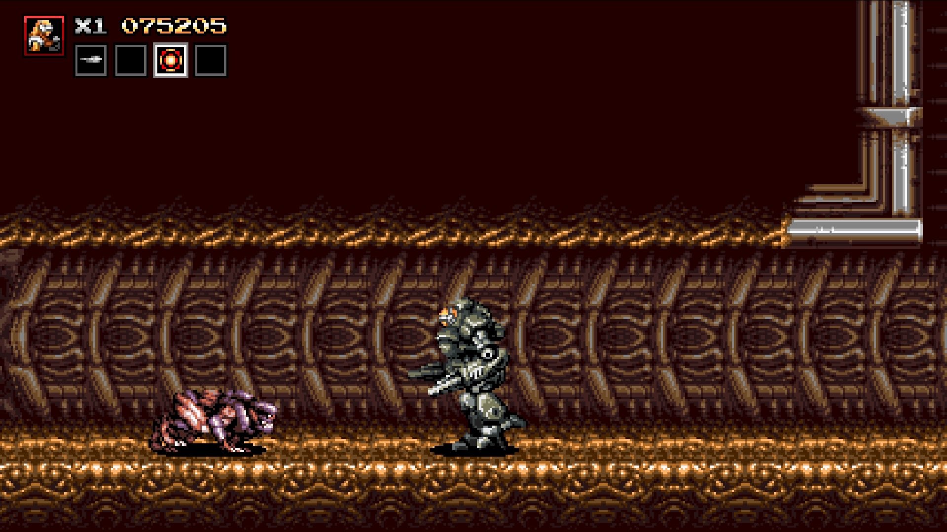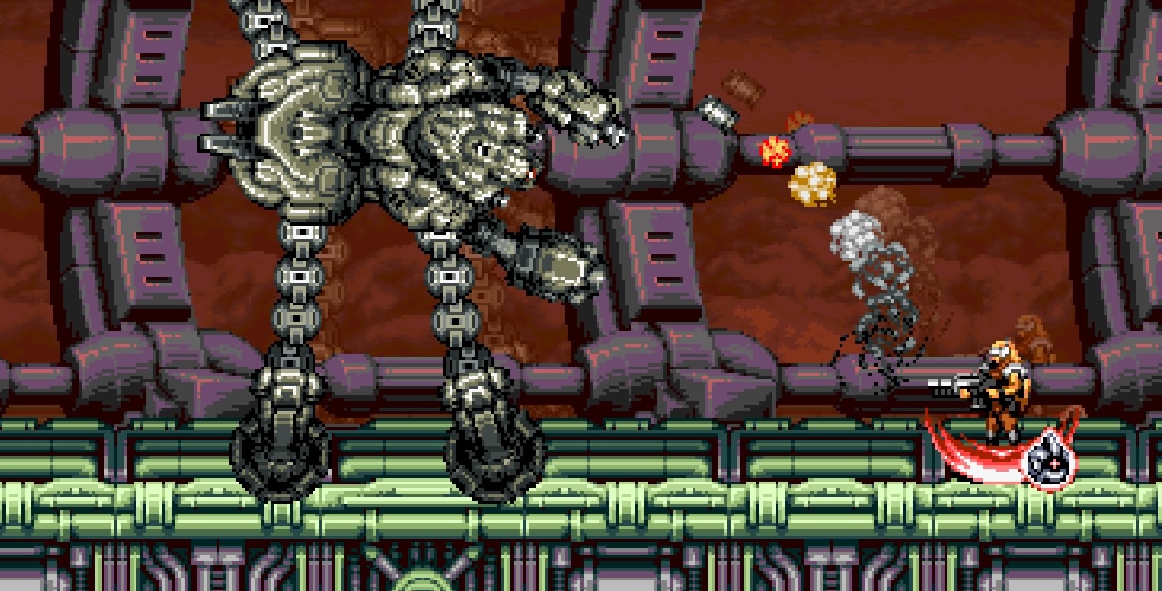 Grafisch lehnt sich Blazing Chrome an die 16-Bit-Ära an, in der Titel wie Contra oder Gunstar Heroes ihre große Ära hatten. Dementsprechend erwartet euch eine Welt im Pixelgewand. Von Stadtruinen über Bahnanlagen, ober- und unterirdischen Militärkomplexen bis hin zu verschneiten Einöden erwartet euch ein bunter Mix an postapokalyptischen Arealen, überrannt von allerlei mechanischem Getier und Mutationen. Trotz der geringen Anzahl an Arealen variieren die Gegner oft genug, sodass keine Monotonie entsteht. Die Endgegner sind makaber in Szene gesetzt, von Riesenspinnen über Kybernetikskelette ist für jeden was dabei. Wer allerdings von Haus aus nicht oder nicht mehr mit der Grafik zurechtkommt, wird vermutlich wenig Freude haben, trotz der liebevollen Details.