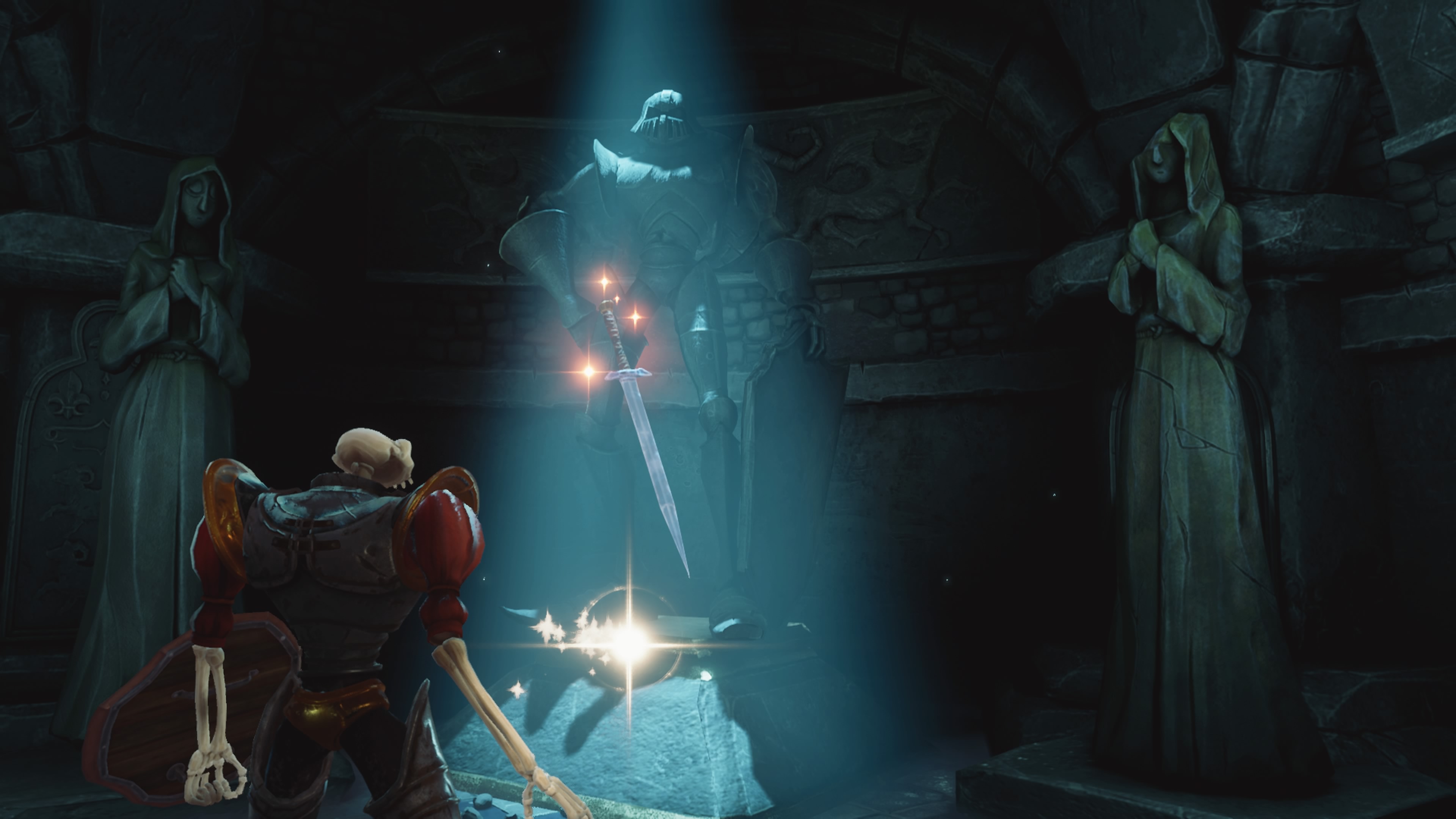 2019 ist die Hintergrundgeschichte des Spiels immer noch dieselbe wie 1998. Ihr spielt den kürzlich wiederauferstandenen Sir Dan Fortesque, einen ehemals noblen Ritter, von dem nach 100 Jahren nicht-ganz-ewiger Ruhe in seiner Krypta kaum mehr als ein Skelett in einer Rüstung übrig geblieben ist. Dennoch zieht er mit einer starken Schwerthand und einem ständig wachsenden Waffenarsenal in die Schlacht, um sein Königreich erneut vor dem Bösen zu retten.