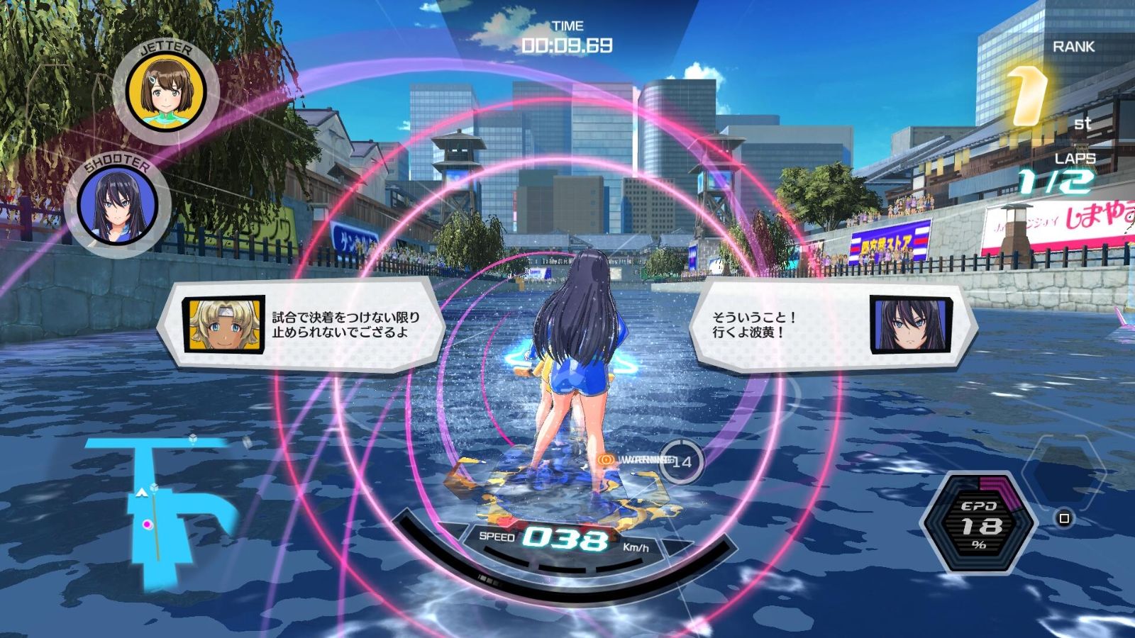 Wir befinden uns in einer Welt, in der der Wasserrennsport „Jet Race“ sehr populär ist. In diesen Rennen treten jeweils Zweierteams gegeneinander an: Der Jetter steuert das Gefährt, der Shooter schießt mit einer Wasserpistole auf die Gegner.