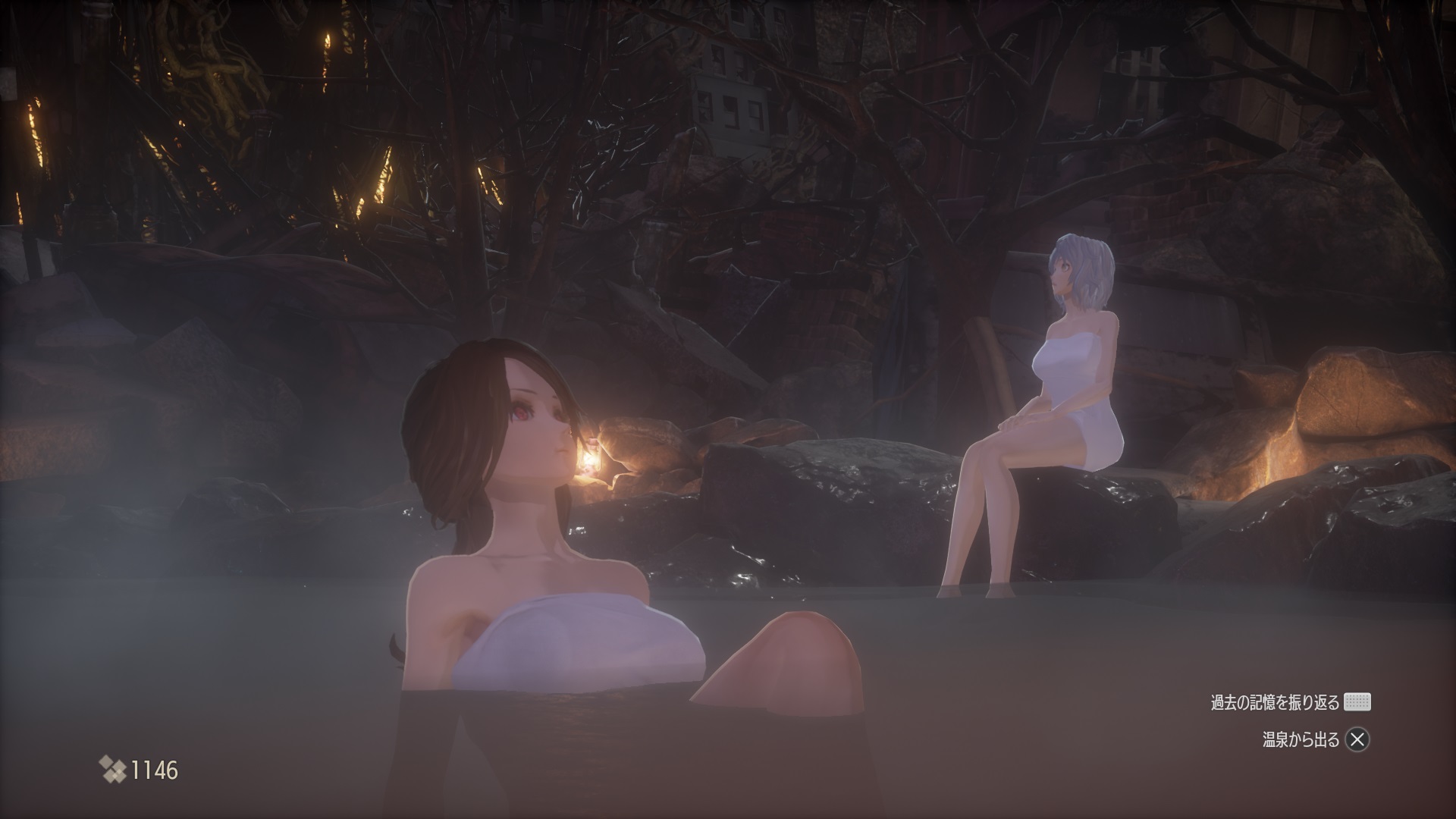 Später greift man hier und da zwar zu etwas anderen Designentscheidungen für manche Erinnerungen, aber am Anfang findet man sich einfach viel zu oft in den Traumsphären und schleicht sich durch zunächst noch nichtssagende Gespräche. Um einen ungefähren Durchblick über die Geschehnisse zu bewahren, bietet Code Vein mit den heißen Quellen einen Ort der Entspannung und neben der Option, den Plot der Geschichte zu rekapitulieren, auch die Möglichkeit, den ein oder anderen Plotpunkt der Charaktere genauer unter die Lupe zu nehmen.