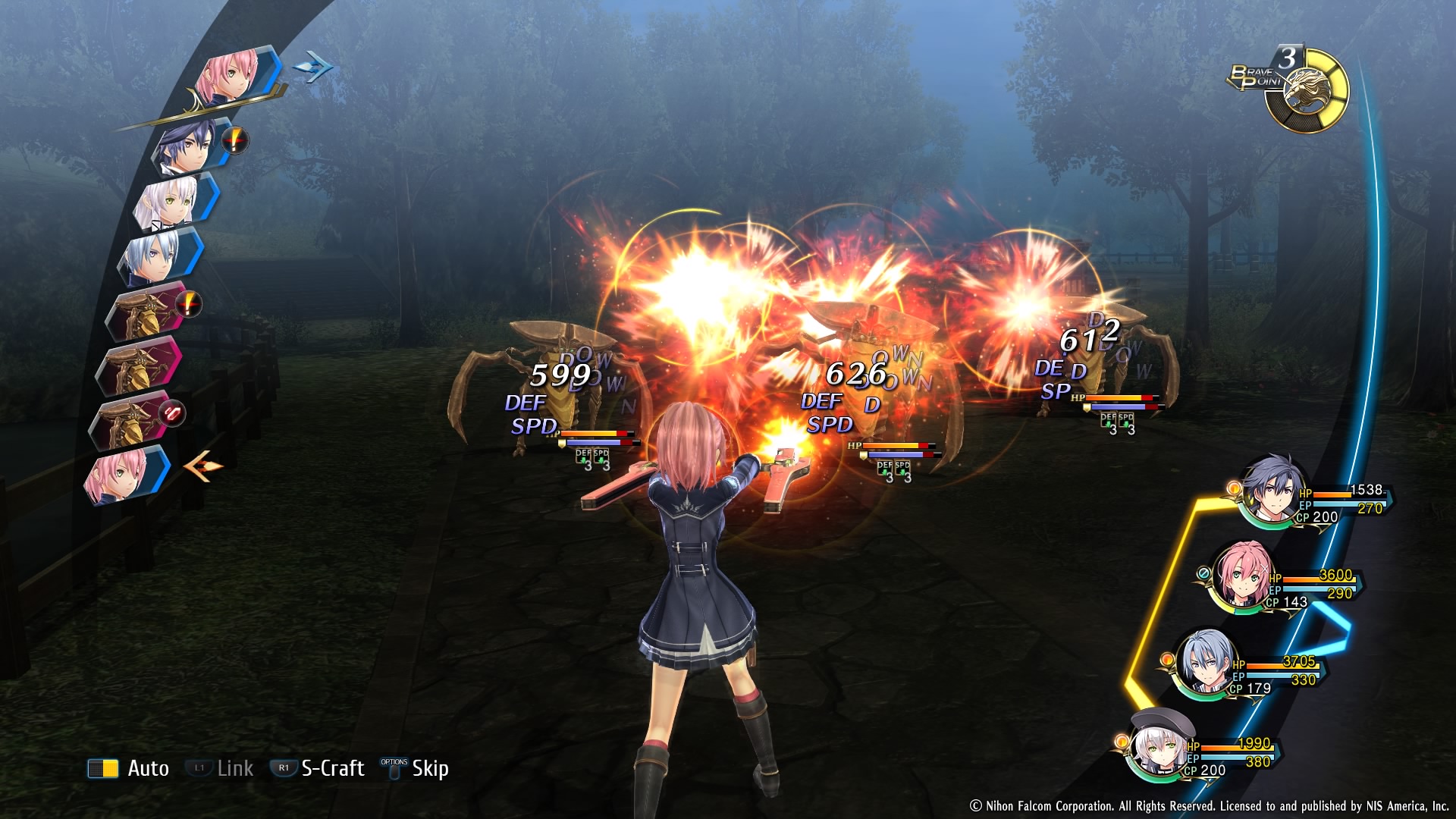 Wie zuvor laufen die Kämpfe auf einer kleinen Kampfkarte ab. Mit bis zu vier Kämpfern (beziehungsweise zwei Kampfpaaren) könnt ihr die Gefechte bestreiten. Sollte es dennoch mal knapp werden, können angeschlagene Charaktere gegen andere im Kampf ausgetauscht werden. Die HP eurer Gegner dezimiert ihr klassisch mit Angriffen, „Crafts“ und „Artes“. Letztere bestimmt ihr durch Quarze, welche ihr in euren Arcus einsetzt. Hier haben wir auch die erste Neuerung in Trails of Cold Steel 3.