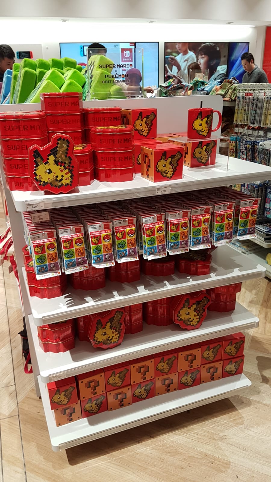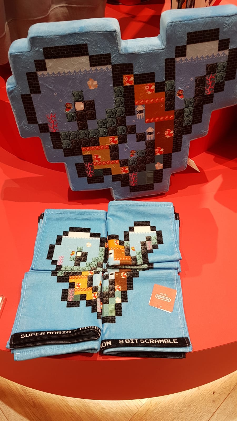 Durch eine Kooperation mit Pokémon standen Shirts und Kissen bereit, auf denen Pokémon in Pixeloptik abgebildet waren. Das Innenleben dieser pixeligen Monster bestand aus Leveln aus dem Super-Mario-Universum. Und wer sich nicht für eine Themenwelt entscheiden konnte, dem standen Brotdosen und mehr in einem Design zur Verfügung, das alle wichtigen Vertreter des Nintendo-Universums im Gänsemarsch aufgereiht zeigte.