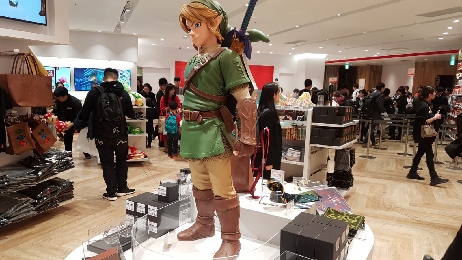 Das Hauptaugenmerk im Laden liegt natürlich auf den riesigen Statuen. Mario, Link, Melinda, Nepp und Schlepp sowie das Inkling-Mädchen begrüßen die Besucher und zeigen an, wo sich welche Themenwelt befindet. Neben Super Mario, The Legend of Zelda, Splatoon und Animal Crossing gab es aber noch zahlreiche weitere Regale, die mit käuflichen Objekten warteten.