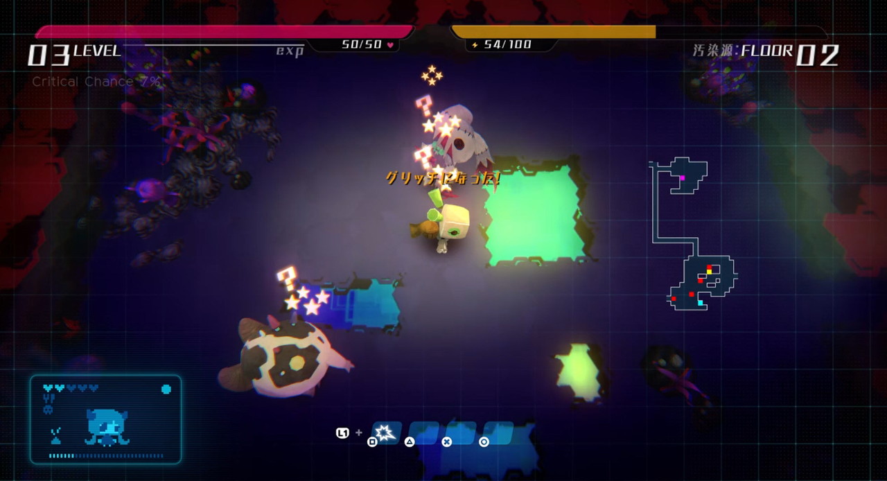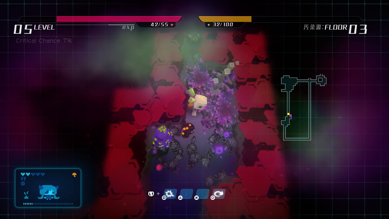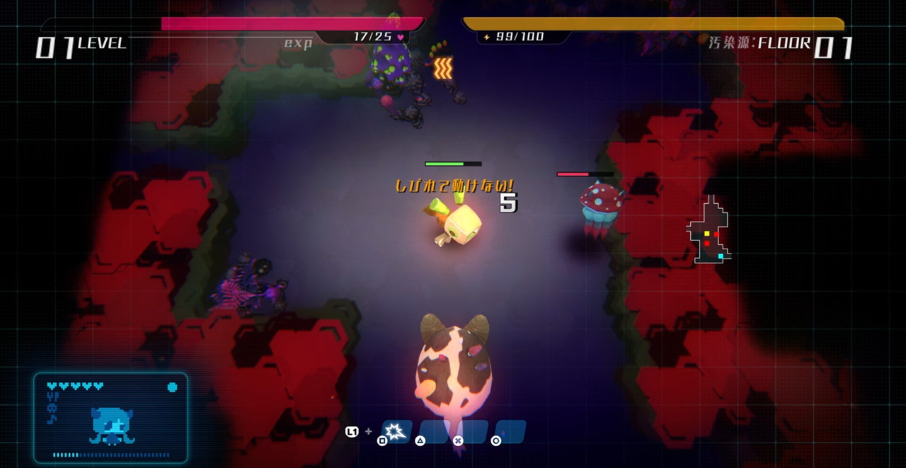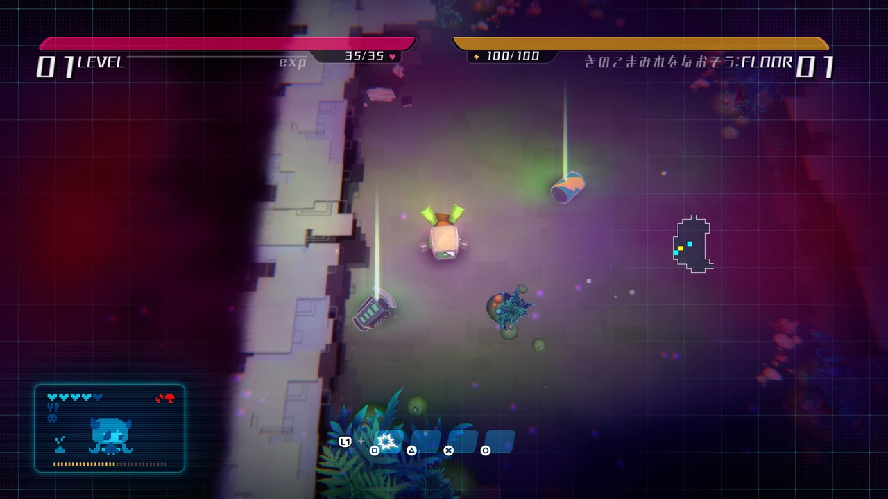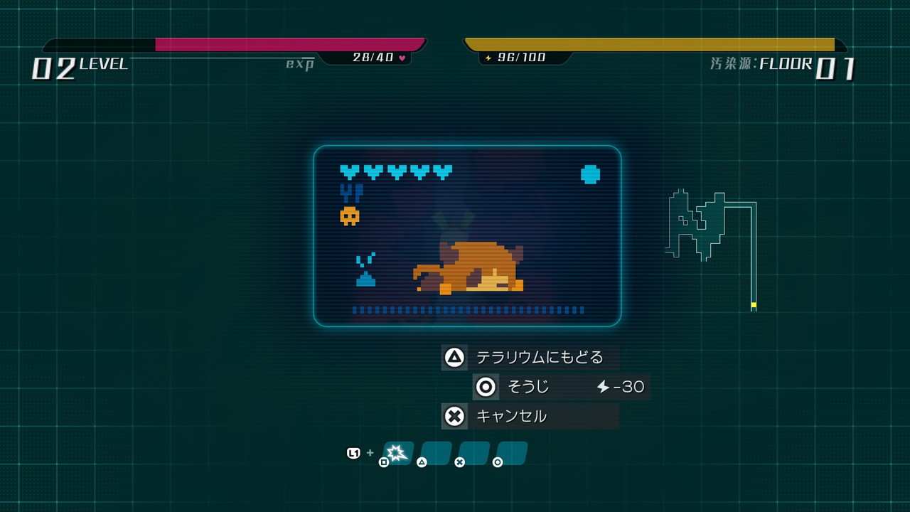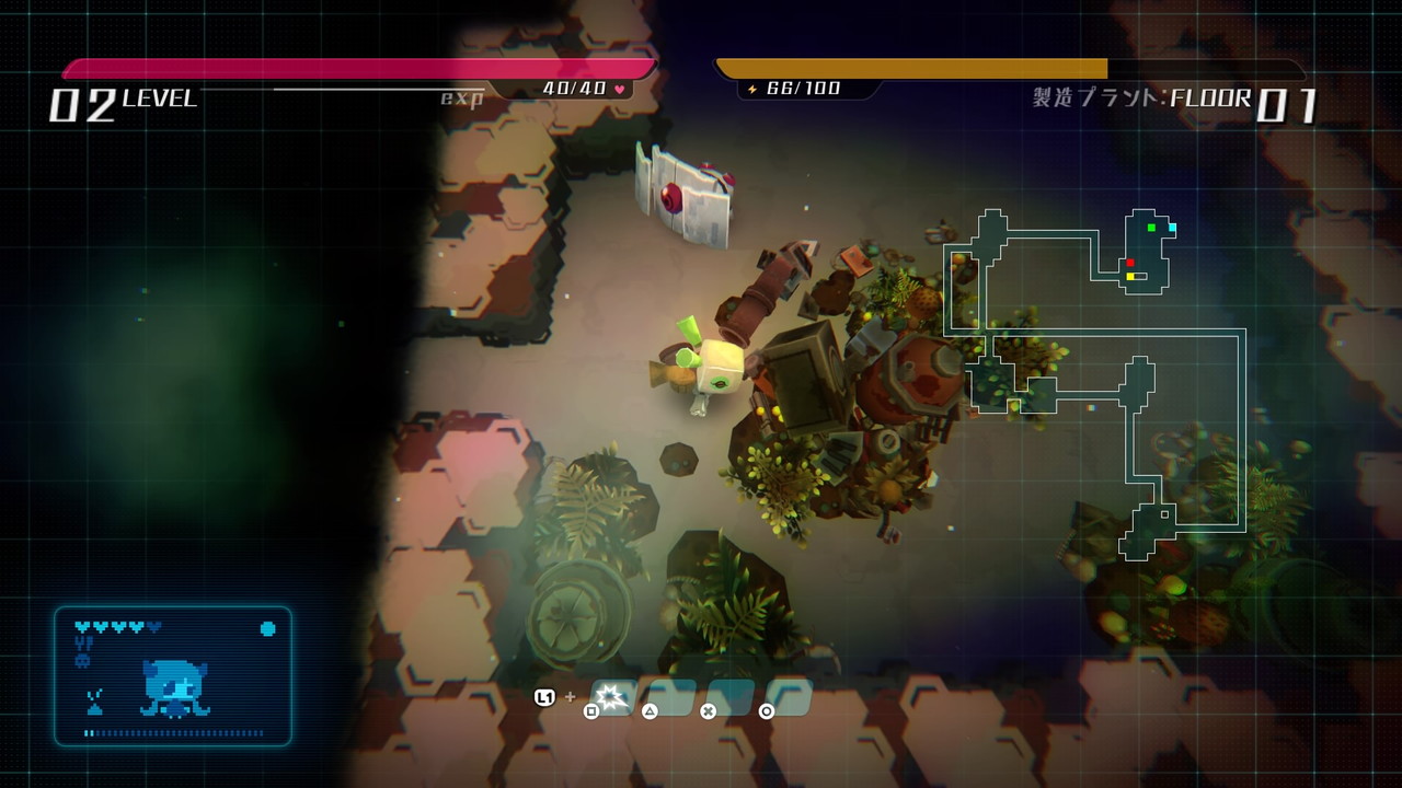 Der Roboter muss also Nahrung, Medizin, Einrichtungsgegenstände und mehr in Dungeons sammeln. Diese werden zufällig generiert. Genretypisch startet man auch jedes Mal wieder auf Level 1. Damit kann man immer wieder neu entscheiden, ob man aus der Ferne oder im Nahkampf gegen Gegner antreten will.