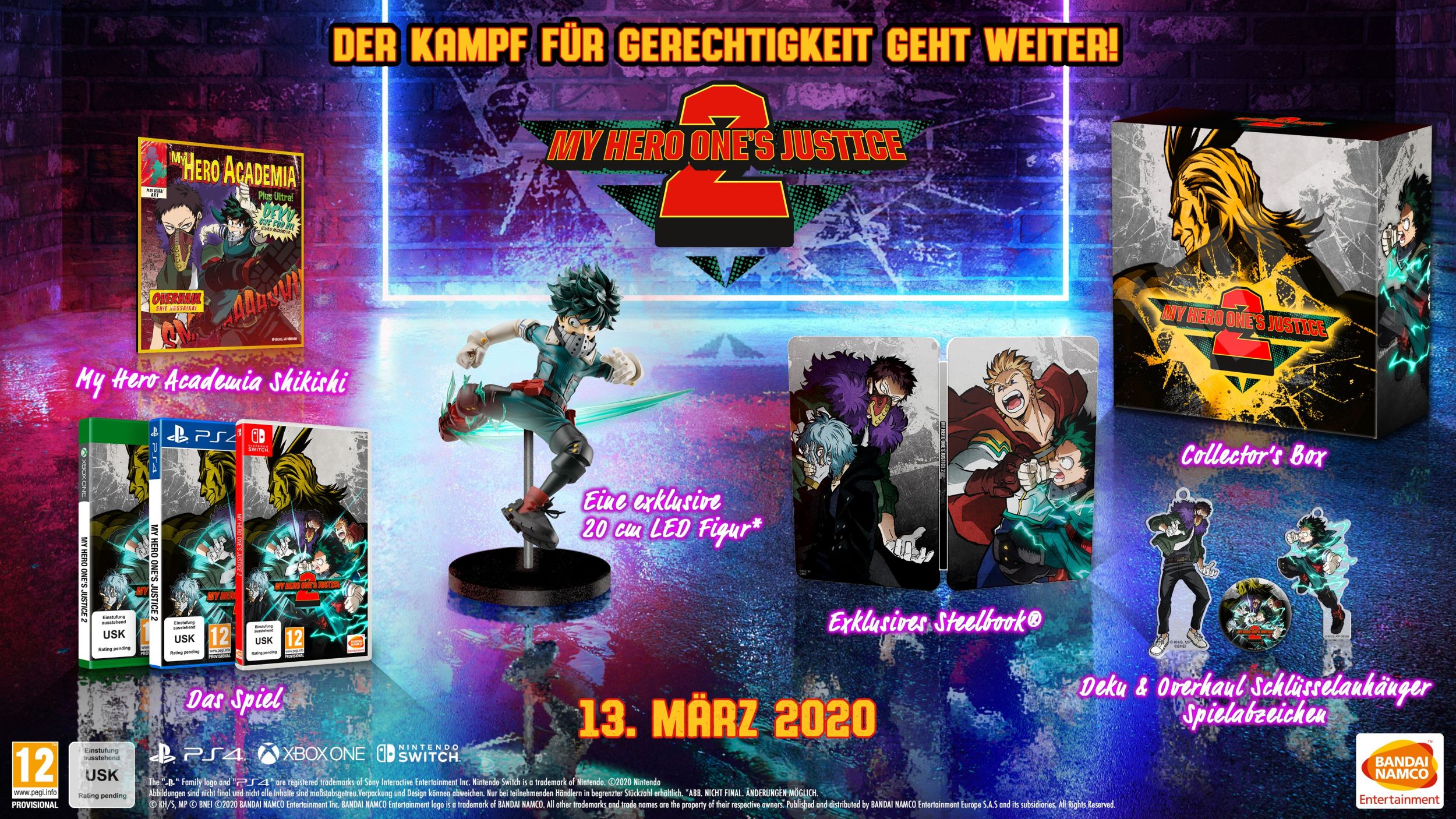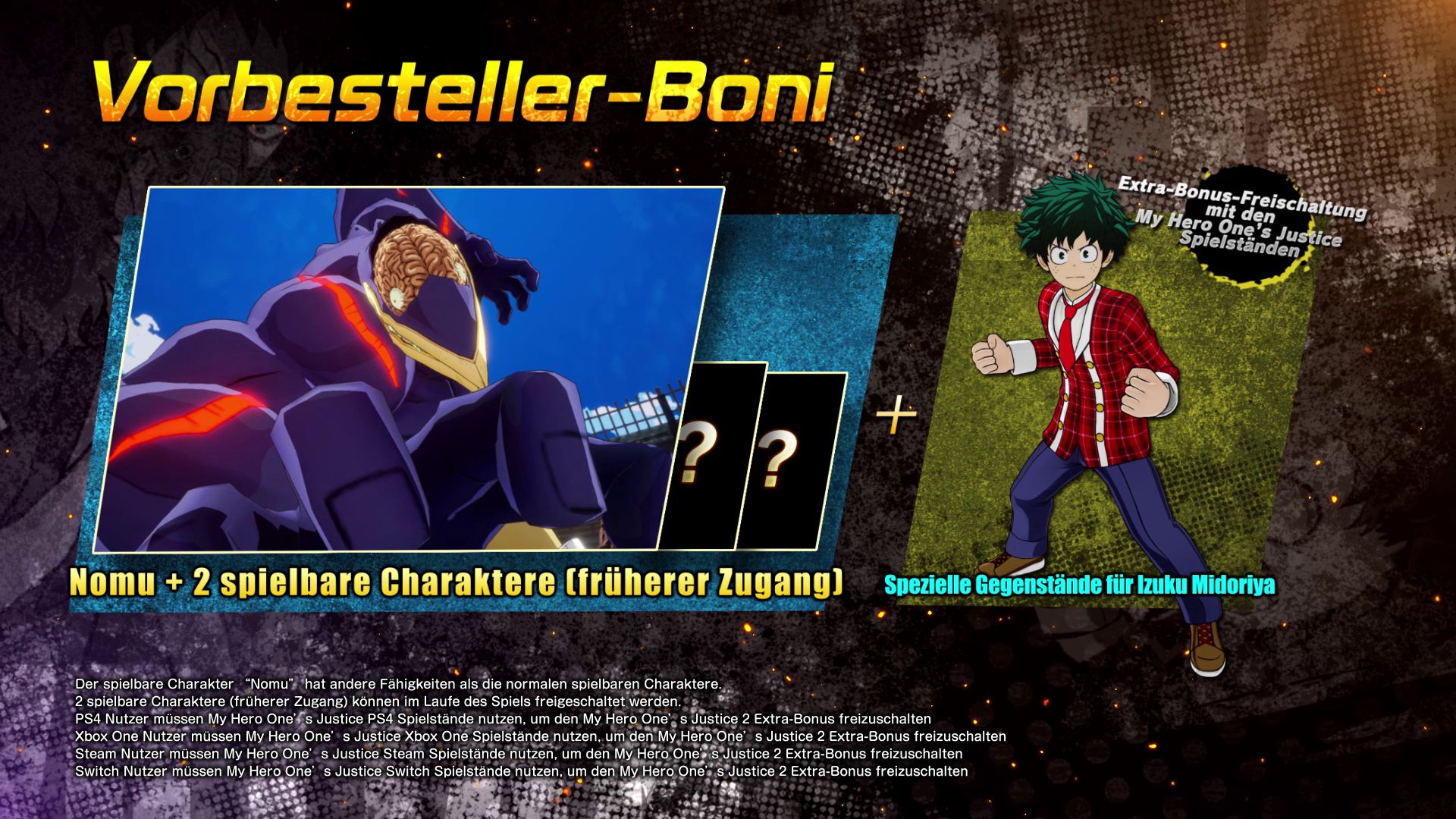 Wenn Fans My Hero One’s Justice jetzt vorbestellen, erhalten sie einen exklusiven Charakter, Nomu, und früheren Zugang zu zwei weiteren Charakteren, die bald bekannt gegeben werden. Zusätzlich kann die limitierte Plus Ultra Edition erworben werden, die eine exklusive 20-cm-Figur, einen Kunstdruck, ein Steelbook, zwei Schlüsselbänder, eine Brosche und das Spiel beinhaltet.