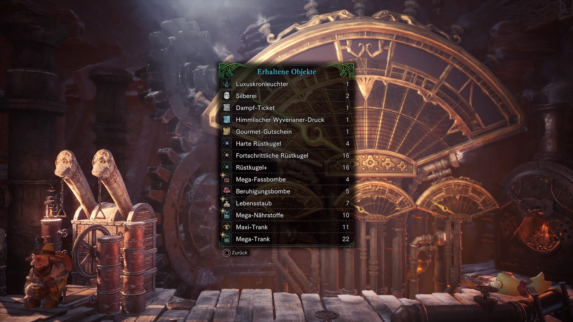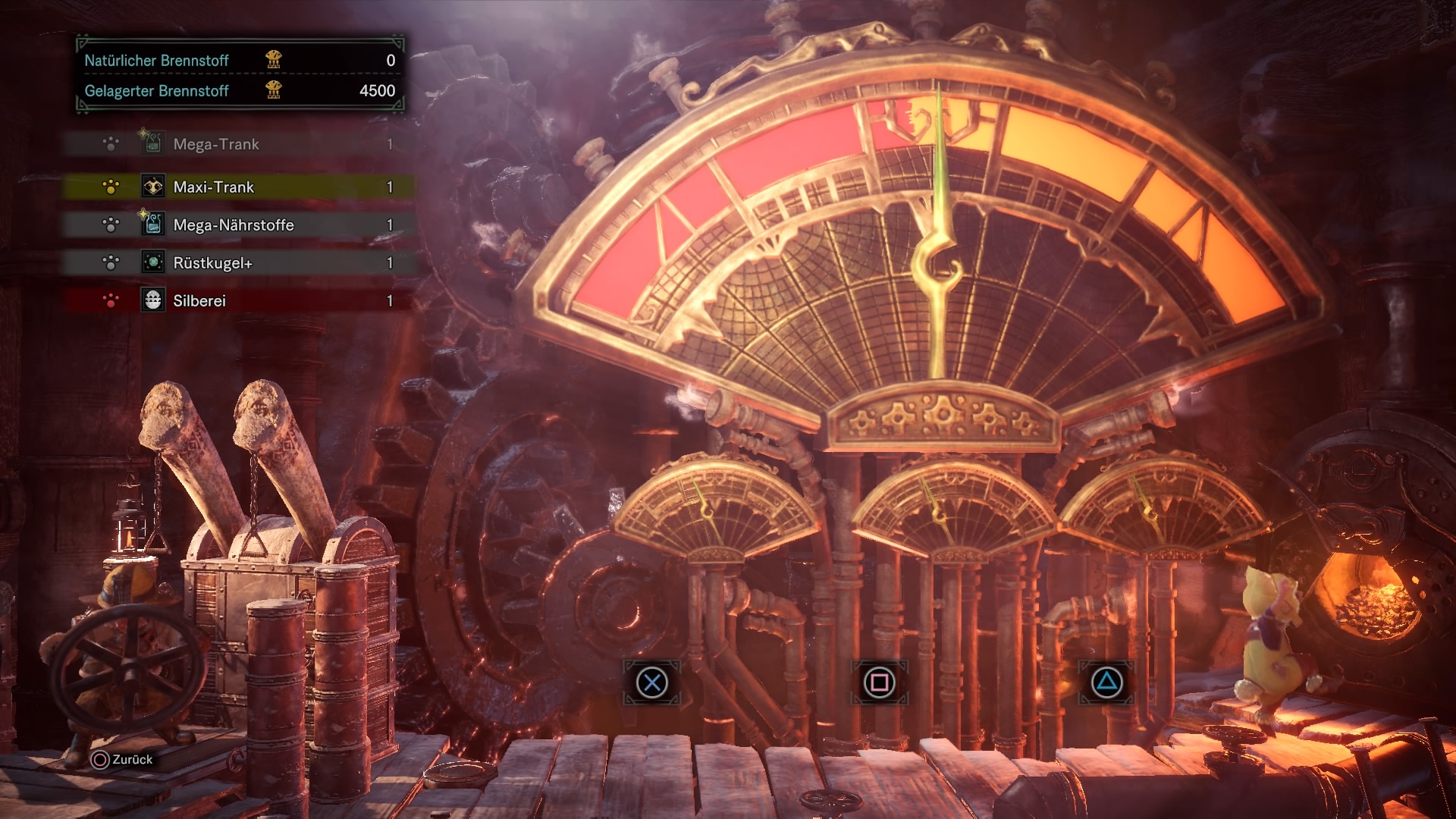 Mit der richtigen Tastenkombination erhöht ihr den Druck im Dampfwerk. Bei jedem Vorgang erhaltet ihr Items und je besser ihr die Kombination trefft, desto bessere Items erhaltet ihr. Heiltränke, spezielle Dampftickets für Rüstungen und Rüstkugeln sind einige der Items. Letztere erhaltet ihr also nicht mehr nur noch durch Beutezüge und Questbelohnungen. Zudem geben einige Beutezüge beim Abschluss mehr Rüstkugeln. Insgesamt erhaltet ihr also deutlich schneller Rüstkugeln als zuvor, was das Aufwerten von vielen Rüstungsteilen deutlich angenehmer macht. Das Minispiel selbst ist ganz nett für zwischendurch. Da die Reihenfolge der Tastenkombination jedoch immer zufallsgeneriert ist, reicht es ebenfalls aus, die R2-Taste gedrückt zu halten. Anschließend läuft alles automatisiert ab.
