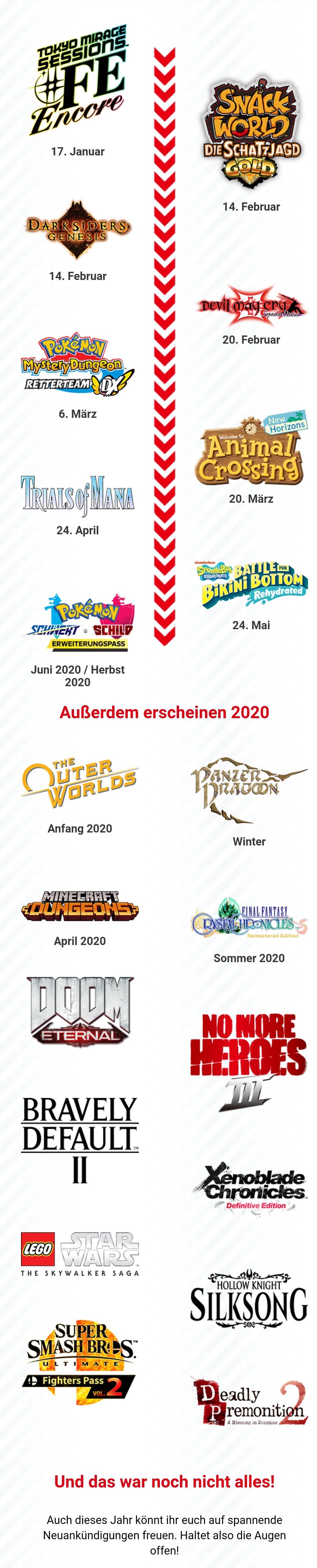 Schon jetzt steht das Spielejahr 2020 für Nintendo unter einem guten Stern. Bereits zu Beginn des Jahres erschien der Titel Tokyo Mirage Sessions ♯FE Encore und natürlich werden noch weitere Spiele folgen. In einer übersichtlichen Infografik hat das Unternehmen nun 21 Titel eingepflegt, die noch 2020 erscheinen werden. Manche davon sind genauer datiert, das Erscheinungsdatum von anderen Titel wiederum bleibt ungewiss.