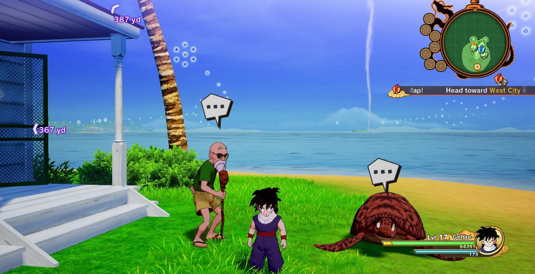 Das Gameplay von Dragon Ball Z: Kakarot kann man am ehesten als eine Mischung aus Open-Field-Gameplay mit actiongeladenen Kämpfen im Beat-’em-up-Stil beschreiben. Ihr könnt die Spielwelt also nicht komplett frei bereisen, wie es bei einem typischen Open-World-Titel der Fall sein würde, sondern reist in einer Art Oberwelt-Hub von Region zu Region. Diese jeweiligen Regionen könnt ihr dann mehr oder weniger frei erkunden.