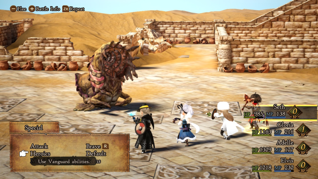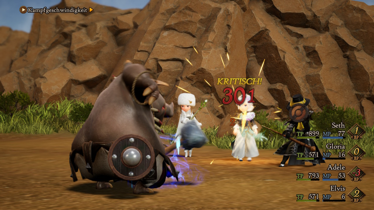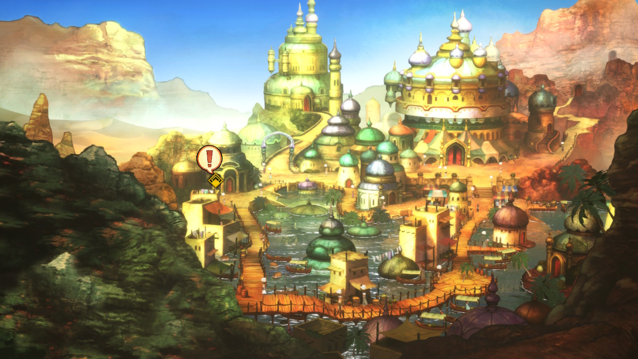 In den ersten Minuten findet man sich in einer wirklich schönen Wüstenstadt wieder. Atmosphärisch konnte man hier die starren Städte in etwas bewegter Form noch einmal besser in Szene setzen. Bei den Hintergründen und der Oberwelt, sowie den kleinen Artworks in Menüs und Umgebungskarte, kommt schon definitiv das Bravely-Feeling auf. Nicht so leider bei den Charaktermodellen. Letztlich wird es wohl der besseren Grafik und der plastischen Darstellung zu Schulde sein, aber irgendwie wollen mir die vier Hauptcharaktere nicht so wirklich gefallen. Die Gegner-Modelle hingegen sind hervorragend und selbst der Boss in der Demo hat ein besseres Design.