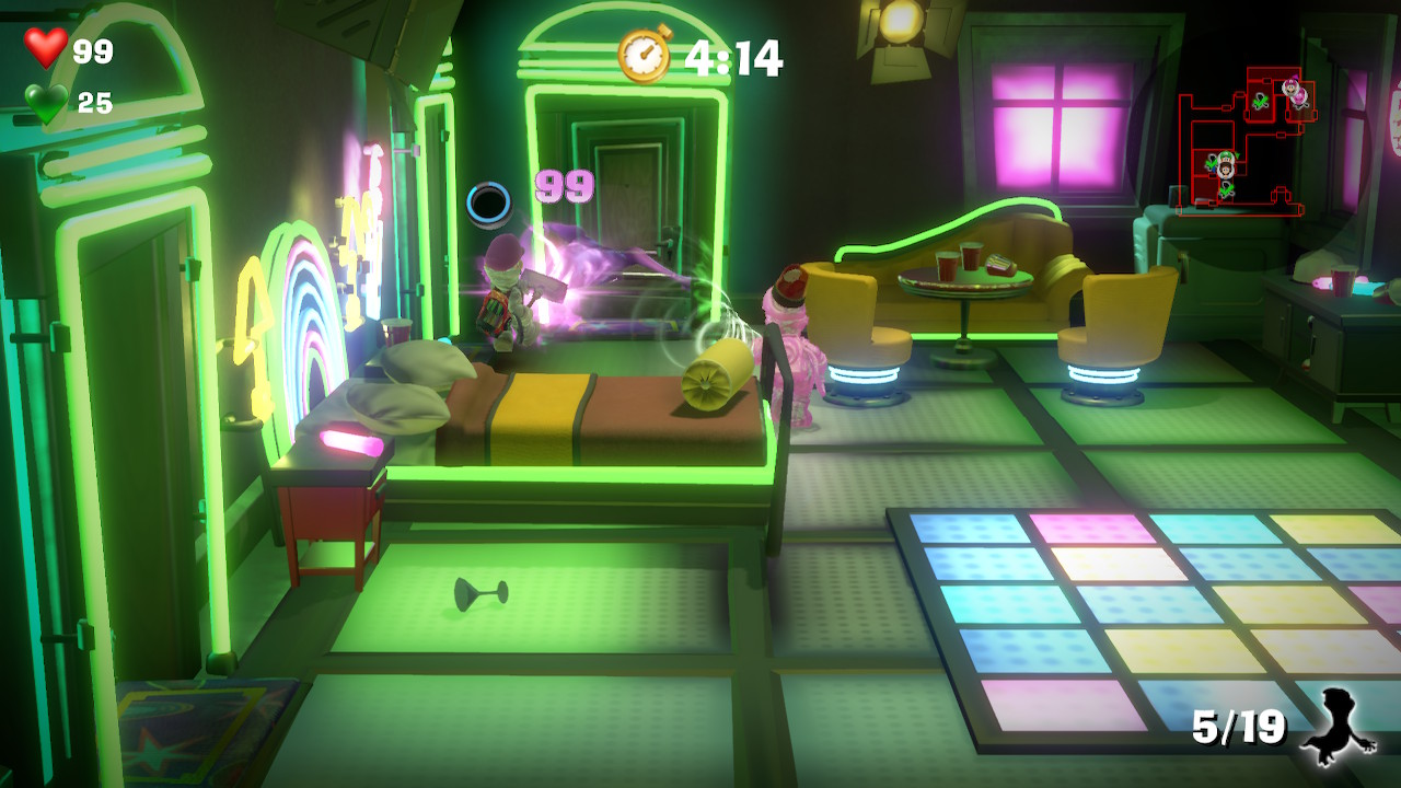 Allerdings muss hierbei gesagt sein, dass die Kostüme rein kosmetischer Natur sind. Ihr erhaltet dadurch keine Boni wie beispielsweise stärkere Saugkraft oder mehr Lebensenergie. Das Einzige, was sich durch die Auswahl eures Kostümes ändert, sind die unterschiedlichen Etagen des Wirrwarrturms. Habt ihr das Diskogänger-Outfit ausgewählt, so kann es beispielsweise passieren, dass ihr mit Neonfarbe bepinselte Geister auf der Tanzfläche einsaugen müsst.