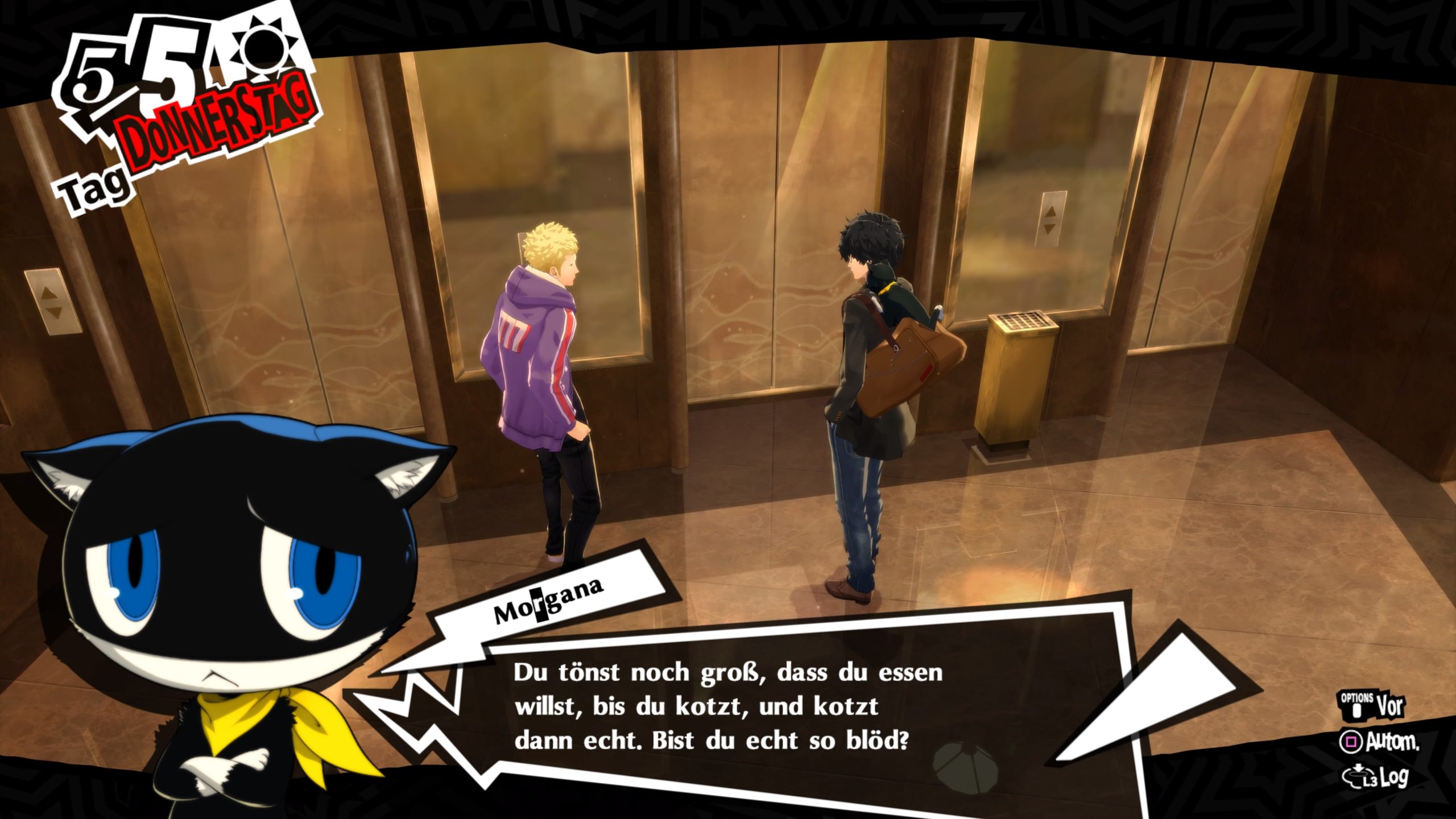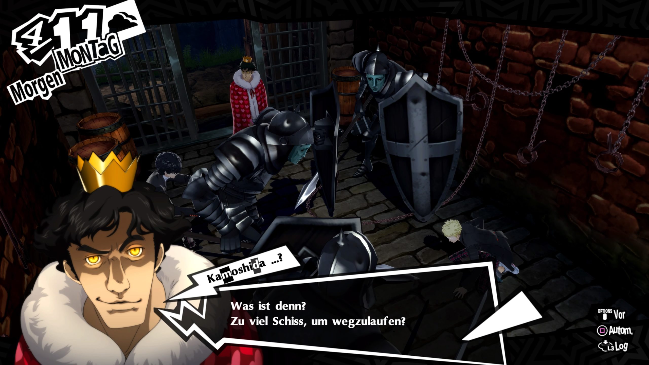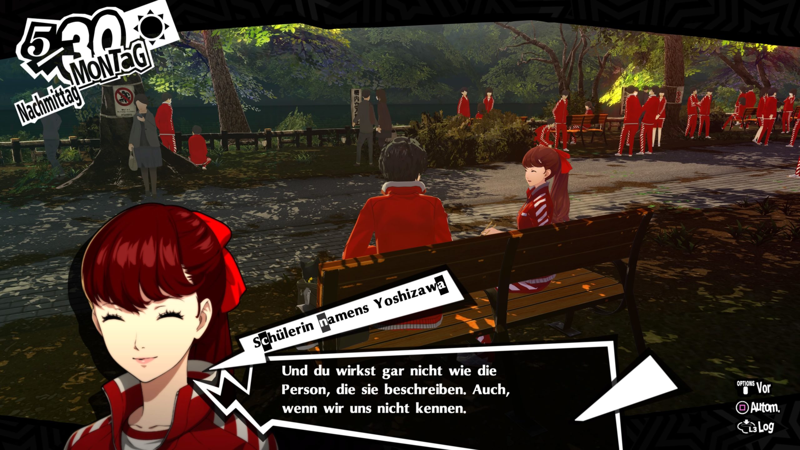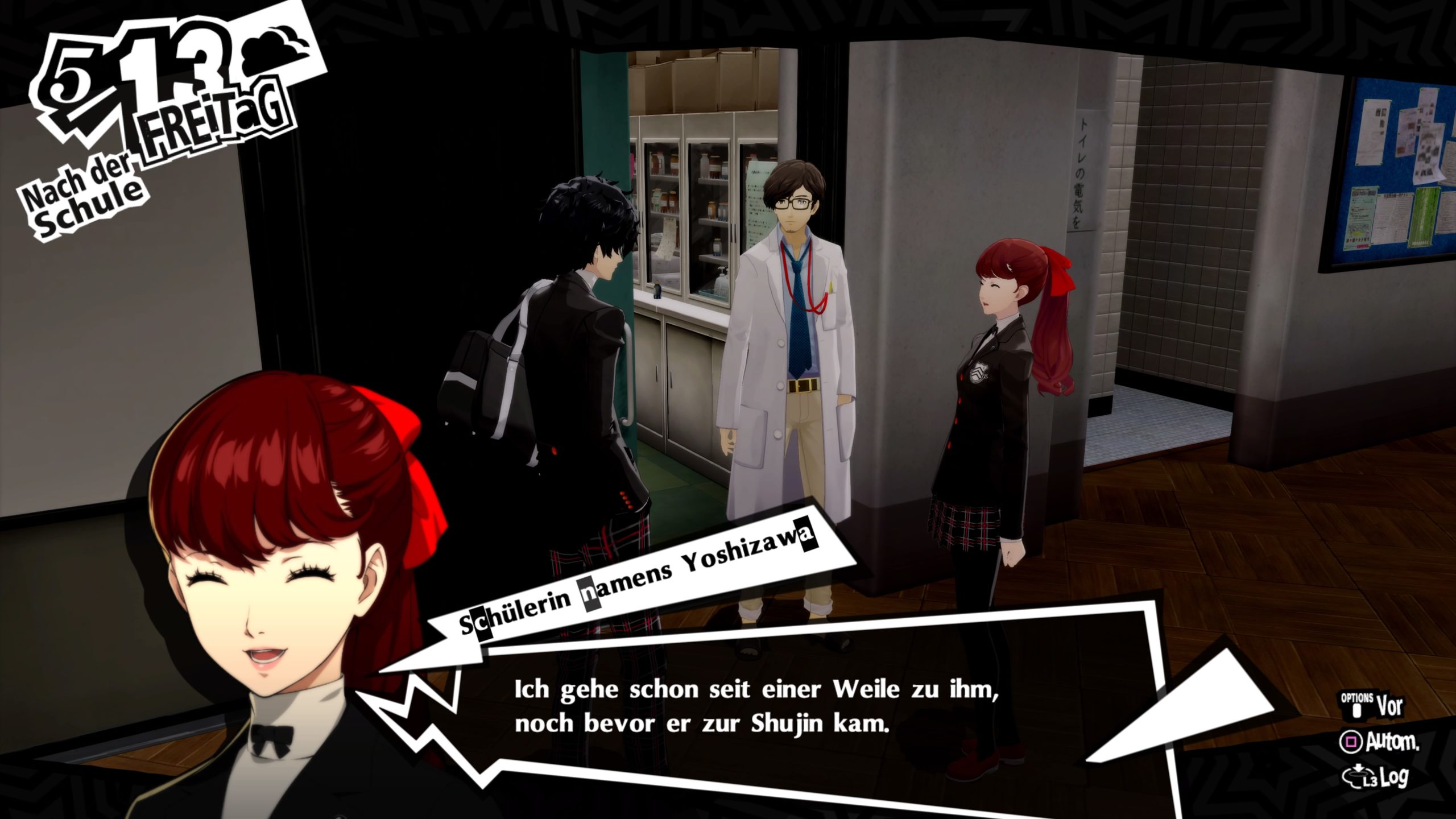 Komplett neu hingegen ist, dass mit Persona 5 Royal ein Spiel der Persona-Hauptreihe nun auch über deutsche Texte verfügt! Zuvor hatten die zwei Persona-Dancing-Spin-offs, die Ende 2018 erschienen, bereits eine deutsche Lokalisierung erhalten, doch kein Spiel der Hauptreihe hatte diese Ehre zuvor. Die ersten 15 Stunden des Spiels habe ich komplett auf Deutsch gespielt. Nach dem Kamoshida-Handlungsbogen habe ich wieder auf Englisch gespielt und ab und zu gewechselt, um manche Szenen zu vergleichen. Die Übersetzung der Dialoge selbst macht generell einen authentischen Eindruck. Hier wurde definitiv keine Übersetzungsmaschine über die englischen Texte laufen gelassen.