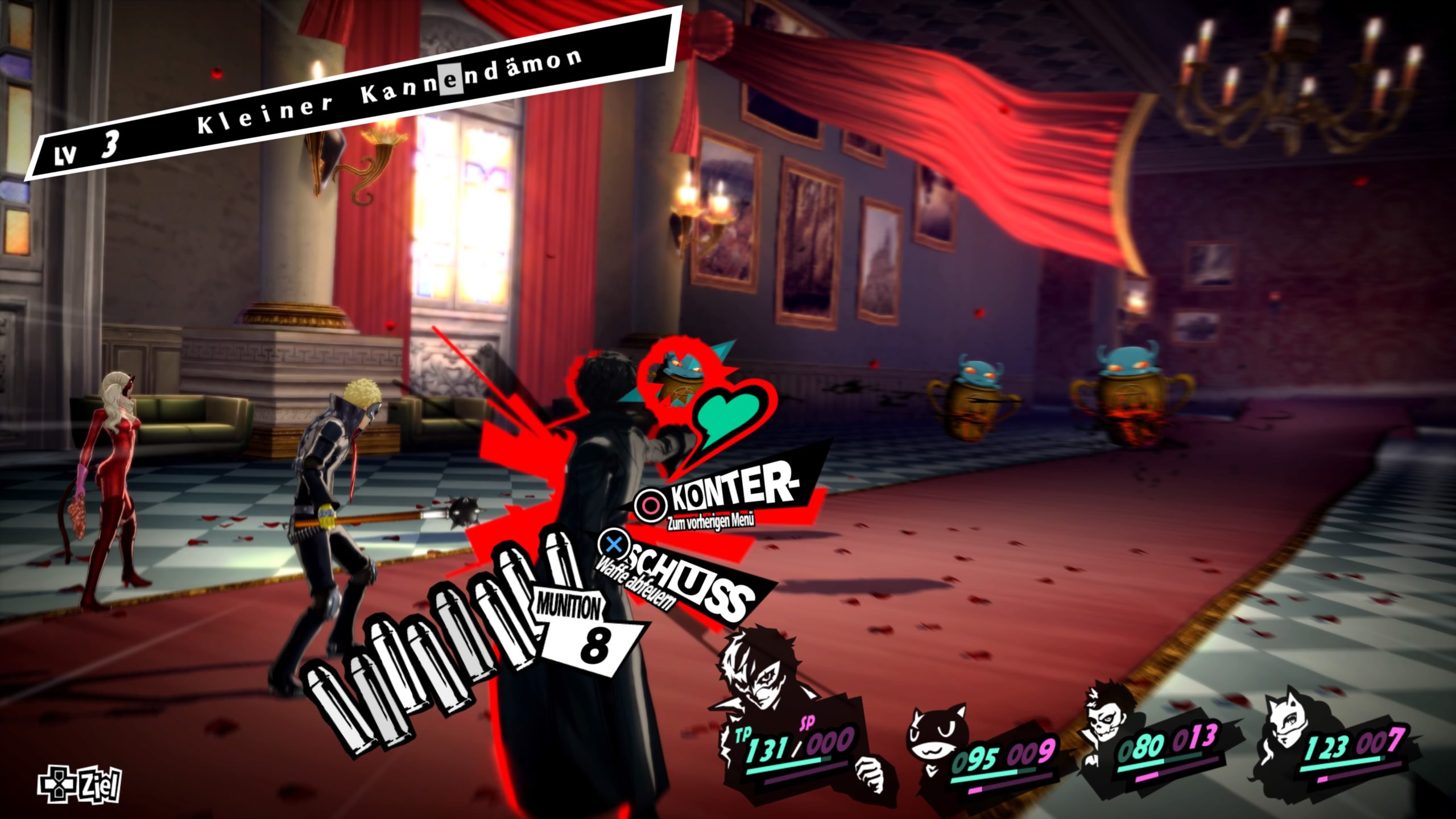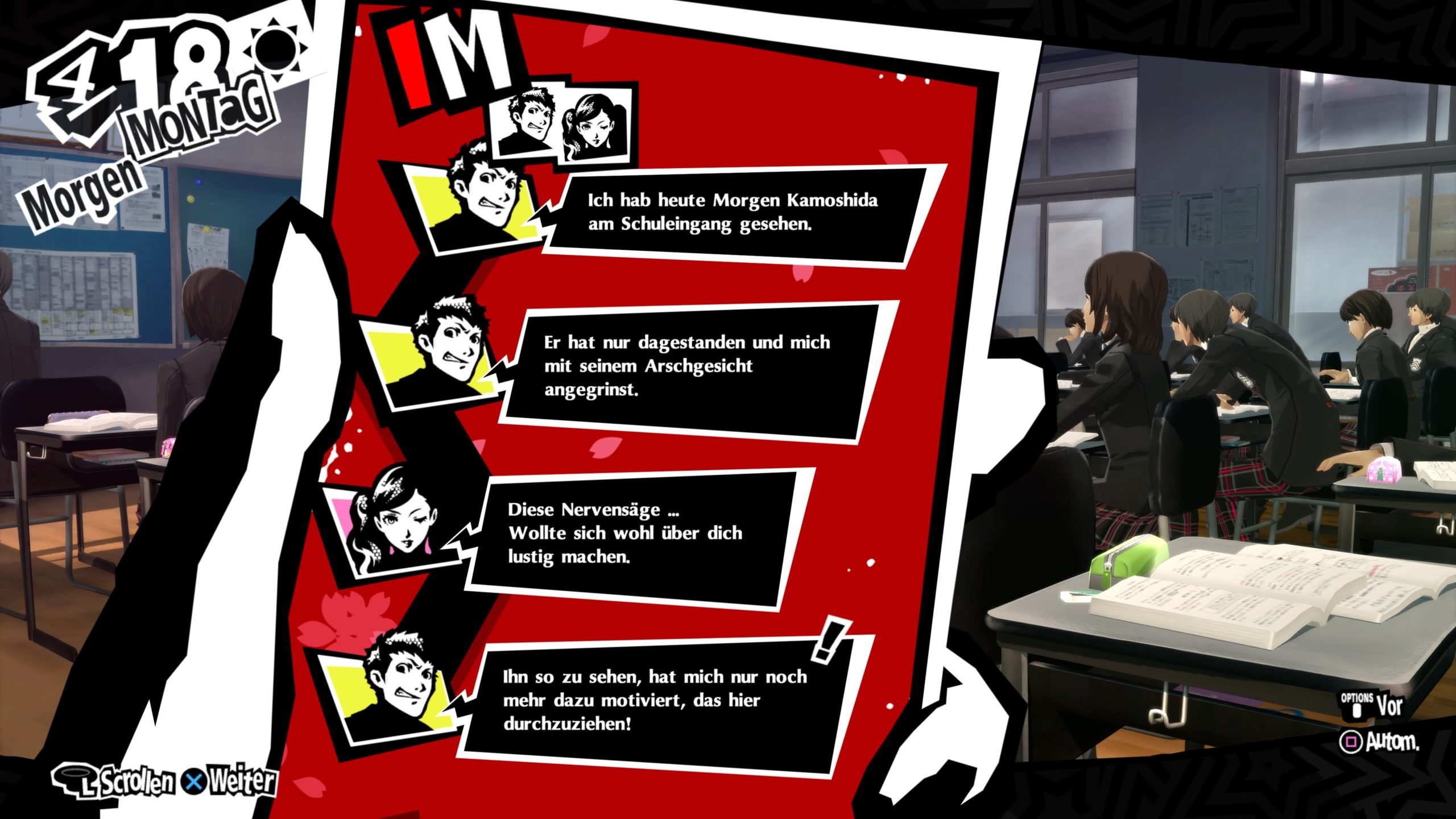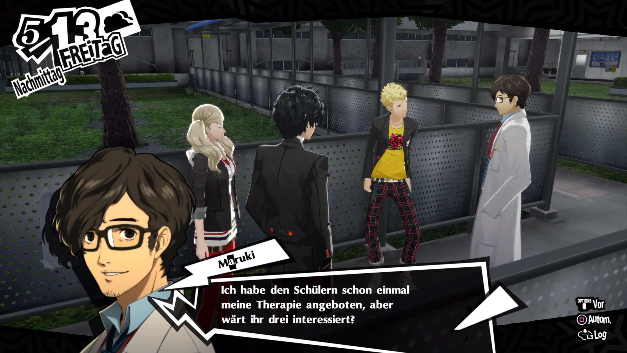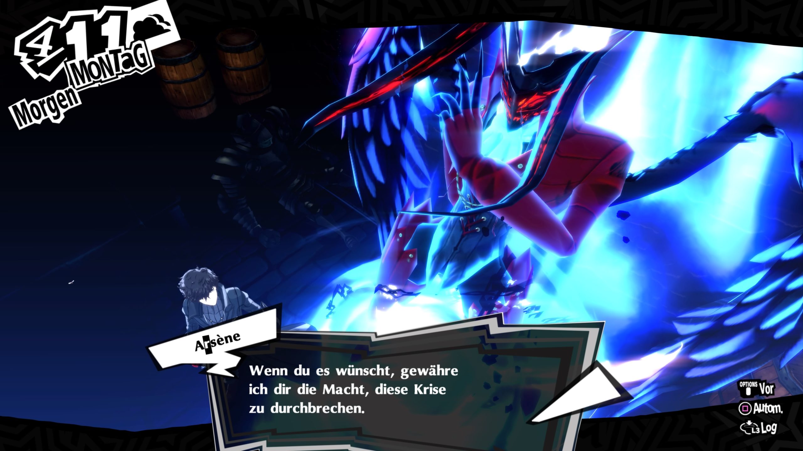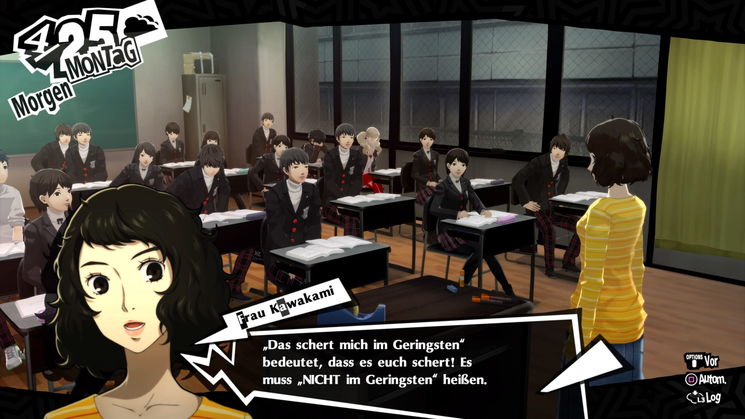Komplett neu hingegen ist, dass mit Persona 5 Royal ein Spiel der Persona-Hauptreihe nun auch über deutsche Texte verfügt! Zuvor hatten die zwei Persona-Dancing-Spin-offs, die Ende 2018 erschienen, bereits eine deutsche Lokalisierung erhalten, doch kein Spiel der Hauptreihe hatte diese Ehre zuvor. Die ersten 15 Stunden des Spiels habe ich komplett auf Deutsch gespielt. Nach dem Kamoshida-Handlungsbogen habe ich wieder auf Englisch gespielt und ab und zu gewechselt, um manche Szenen zu vergleichen. Die Übersetzung der Dialoge selbst macht generell einen authentischen Eindruck. Hier wurde definitiv keine Übersetzungsmaschine über die englischen Texte laufen gelassen.