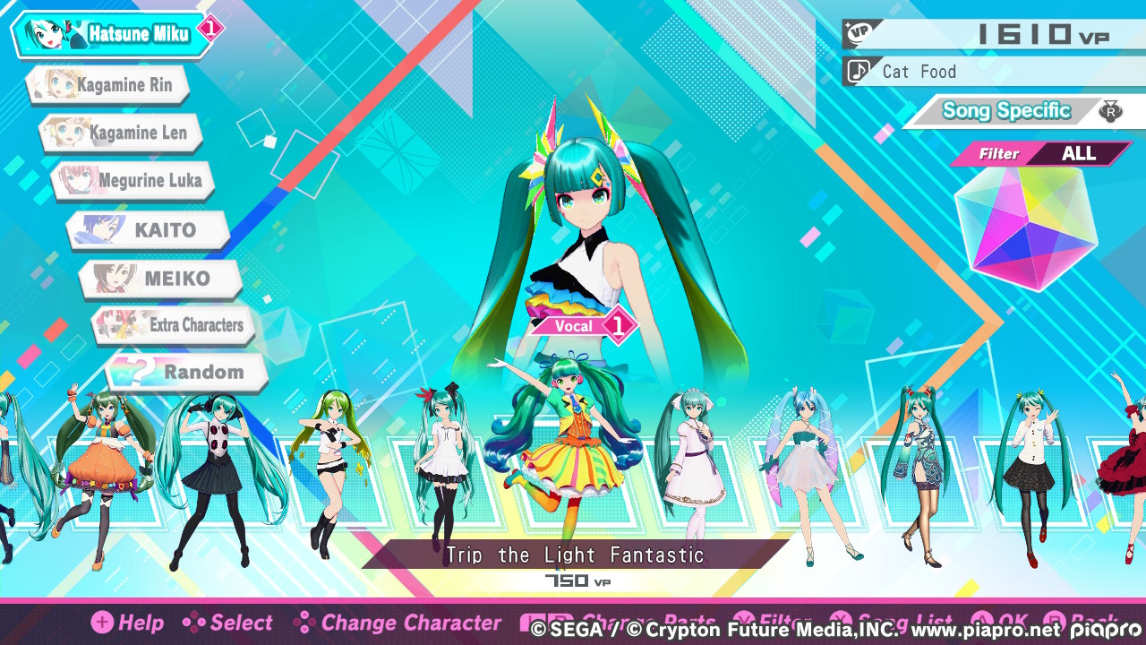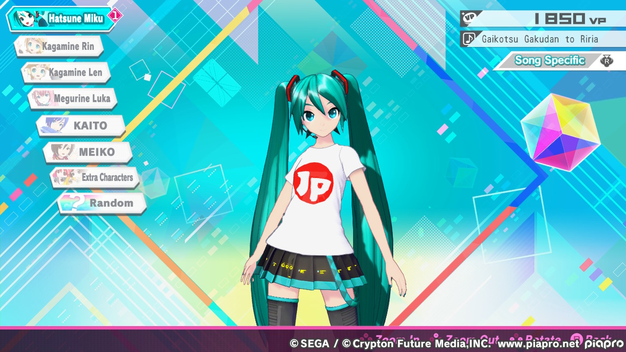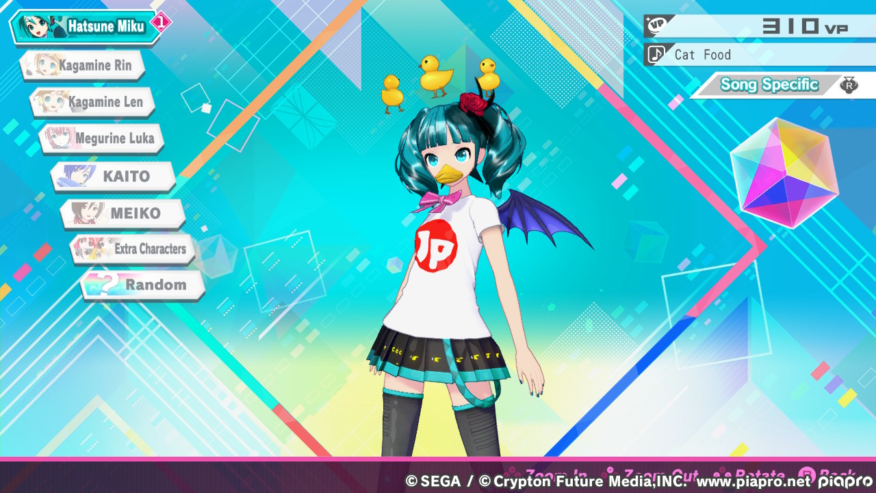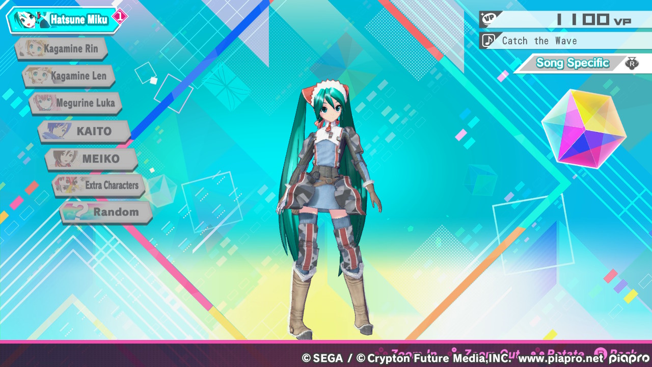 In Project-DIVA-Spielen geht es darum, bei laufender Musik die richtigen Tasten im richtigen Moment zu drücken, halten oder zu kombinieren. Ein klassisches „rhythm game“ also. Während im Vordergrund Symbole für die Noten über den Bildschirm sausen, läuft im Hintergrund eine Choreographie mit 3D-Modellen oder auch mal ein animiertes Video ab. Nach Abschluss eines Liedes wird eure Leistung eingestuft und ihr werdet mit VP (vermutlich „Vocaloid Points“) und Rangpunkten belohnt. Im Rang aufzusteigen hat meiner Erfahrung nach keinerlei Auswirkung; alle 101 Lieder sind von vornherein freigeschaltet. Doch was könnt ihr mit VP anfangen?
