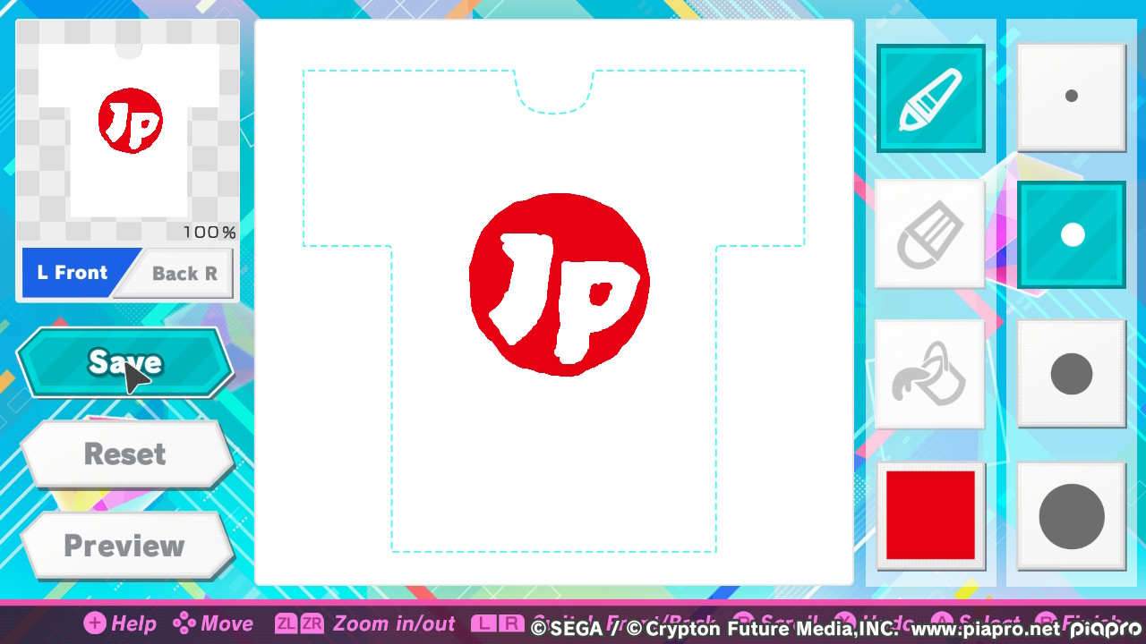 Da es gerade um Kleidung ging, kann man gleich eines der neuen Features von Project DIVA Mega Mix erwähnen: den Shirt-Editor. Bis zu fünf Shirtdesigns könnt ihr im Spiel entwerfen. Zwar ist der Editor selbst etwas mager an Features und die Steuerung mit Controller oder Touchscreen fummelig, dennoch konnte ich es mir nicht nehmen lassen, ein JPGames-Shirt zu entwerfen. Es sieht auch in Aktion schick aus!
