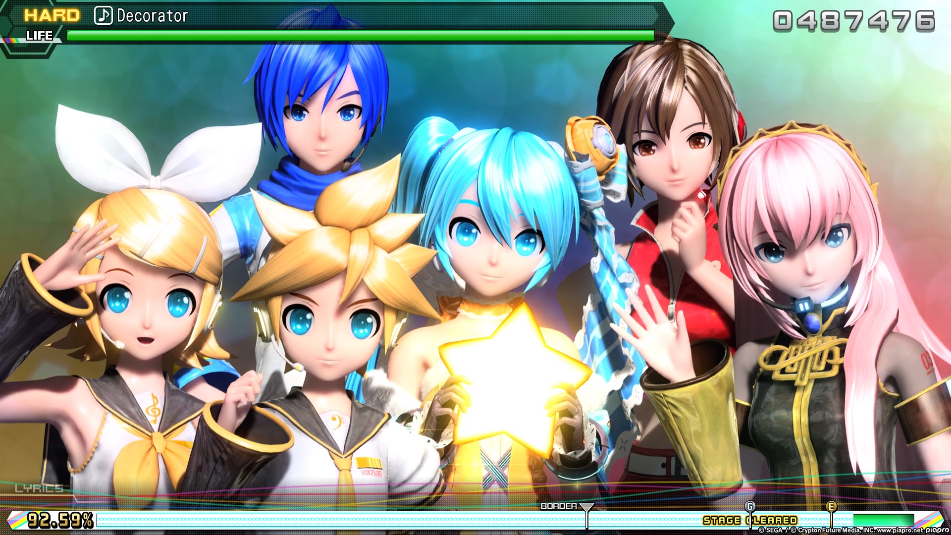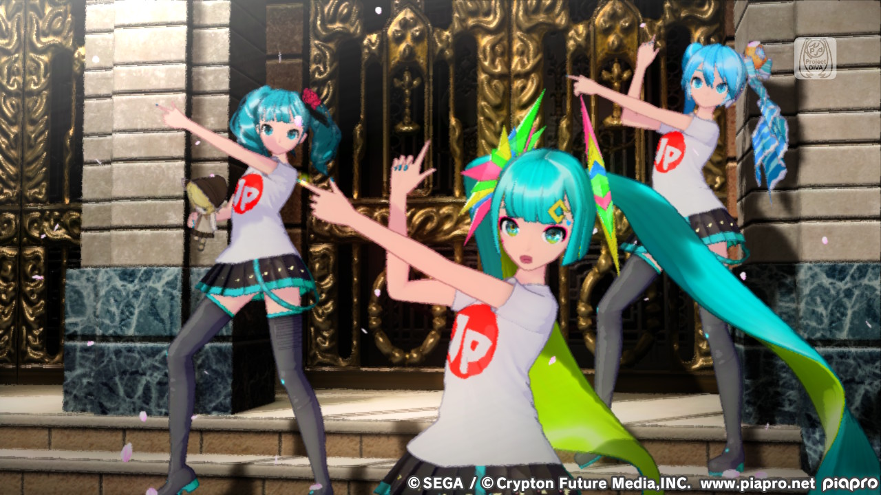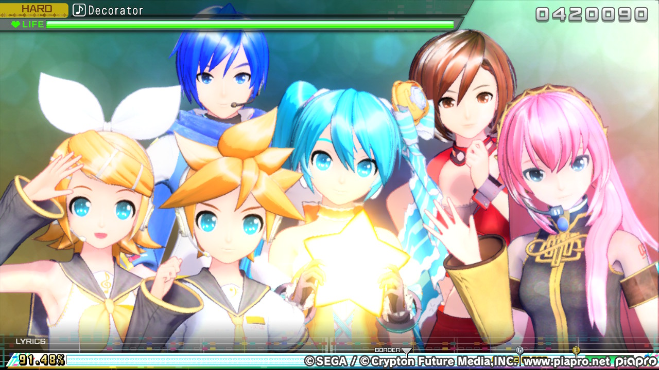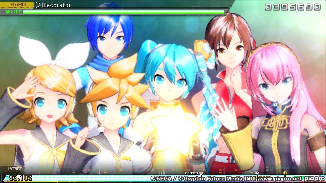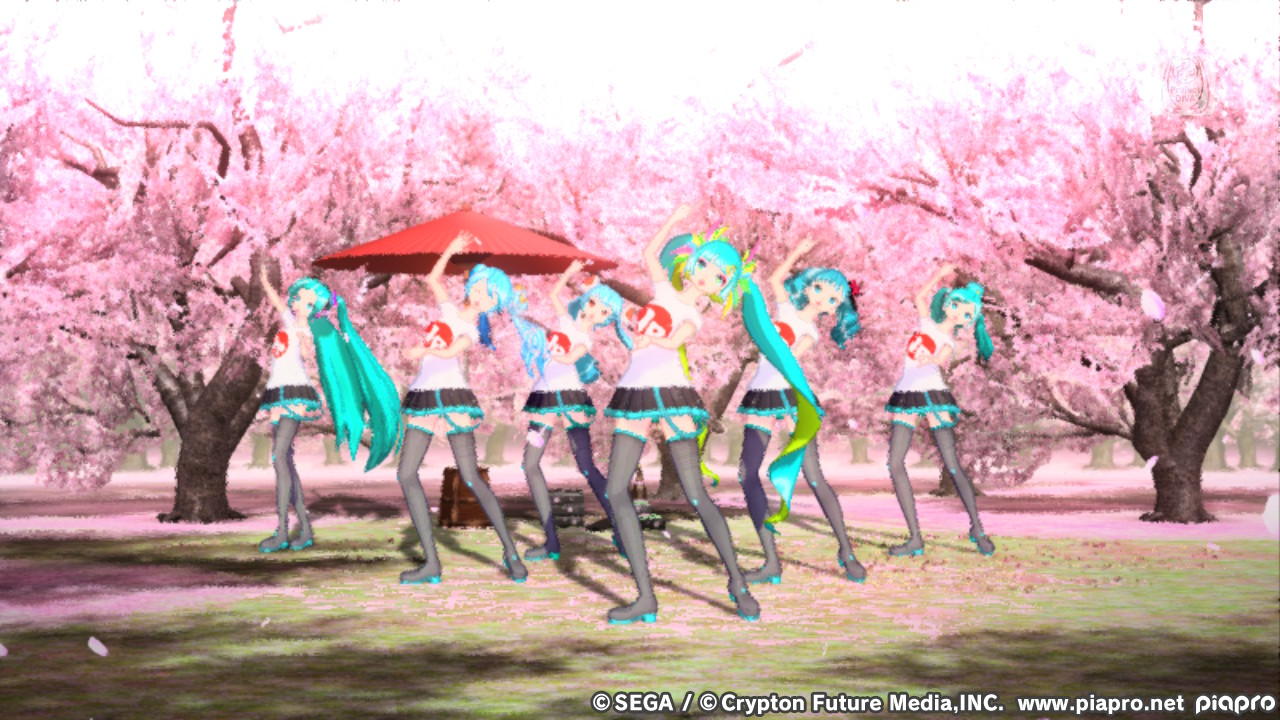 Aber wie im Screenshot dreht das Spiel die Auflösung echt krass runter, wenn mehrere Vocaloids auf dem Bildschirm sind.