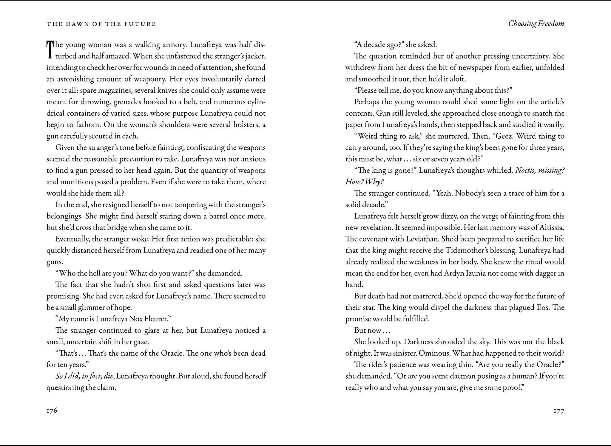 Immerhin, ein Buch sollte es noch geben, in dem weitere Ereignisse des Spiels besprochen würden. Der Roman, der den gleichen Namen erhielt wie das einst geplante DLC-Paket, soll die Geschehnisse, die in Episode Aranea, Luna und Noctis vorkommen sollten, zusammenfassen.