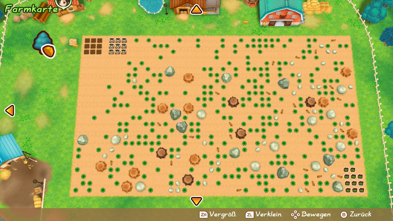 So liegt es an euch, dem Bauernhof wieder zu seinem alten Glanz zu verhelfen. Ihr müsst das Feld zunächst von Unkraut, Steinen und Ästen befreien. Das ist allerdings keine Arbeit für einen Tag, denn auf dem Feld finden sich größere Stümpfe und Felsen, die ihr mit eurer momentanen Ausrüstung nicht zerkleinern könnt. Zudem macht euch die Ausdaueranzeige einen Strich durch die Rechnung, denn jedes Mal, wenn ihr ein Werkzeug nutzt, verliert ihr ein wenig eurer Ausdauer.