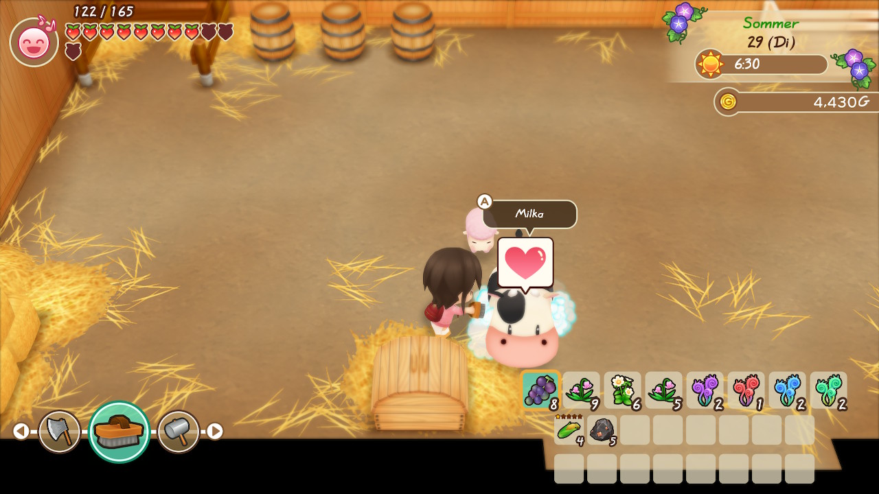 Ein Hauptbestandteil von Story of Seasons ist es, sich täglich um all eure Tiere zu kümmern. Sie wollen gebürstet, gefüttert und gemolken beziehungsweise geschoren werden. Je besser ihr euch um eure Tiere kümmert, desto lieber haben sie euch und desto höher ist die Qualität der produzierten Güter. Habt ihr einmal keine Lust, euch um eure Tiere zu kümmern, könnt ihr die heimischen Erntewichtel bitten, euch bei eurer Arbeit zu unterstützen. So kümmern sie sich um die Tiere, können euch aber auch bei der Feldarbeit zur Hand gehen.