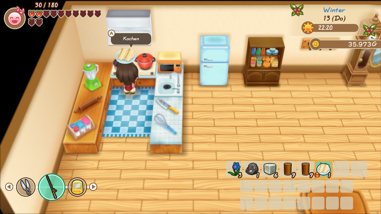 Dabei müsst ihr euch wirklich abhetzen, denn der Tag vergeht in Friends of Mineral Town sehr schnell. Wenige Sekunden im echten Leben sind bereits 10 Minuten im Spiel. Da manche Geschäfte nur zu bestimmten Zeiten geöffnet haben, wird es zu einem stressigen Tag, wenn ihr mal nicht exakt im Zeitplan seid, weil vielleicht doch ein Erntewichtel nicht mehr bei der Arbeit hilft oder ein zufälliges Event euch um einige Stunden nach hinten versetzt.