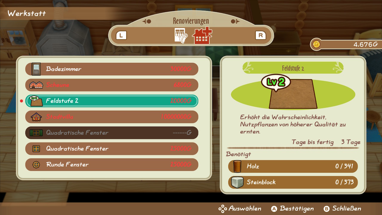Ein weiterer Punkt, weshalb ihr die Konsole wahrscheinlich nicht aus euren Händen legen könnt, sind die vielen Neuerungen, die mit der Zeit stetig hinzukommen. Hier mal eine neue Saatsorte, da eine neue Maschine oder sogar eine Neuerung für euer Haus, wie beispielsweise ein eigenes Bad, machen es schwer, zu entscheiden, wofür ihr euer Geld als Nächstes ausgeben wollt. So ist man als Spieler ständig motiviert, den drögen Alltag in Kauf zu nehmen, um sich endlich die Villa leisten zu können, von der man geträumt hat.