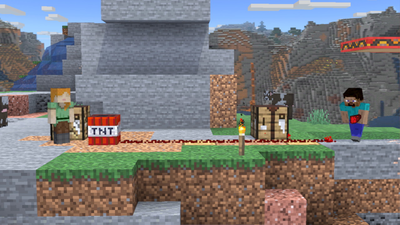 Sehen wir uns doch nun die restlichen Spezialangriffe an. Beim Spezialangriff Unten platziert der Charakter einen TNT-Block. Die Explosion des Blocks macht jedem Kämpfer ordentlich Schaden, der in der Nähe steht – auch einem selbst. Deshalb hat man die Möglichkeit, eine Redstone-Leitung mit Druckplatte zu verlegen, indem man den Spezialknopf gedrückt hält und sich vom Sprengstoff wegbewegt. Kommt der Sprengstoffblock mit Feuer in Berührung, explodiert er sofort. Ansonsten kann man ihn auch liegen lassen und die Explosion folgt nach einer Weile von alleine.