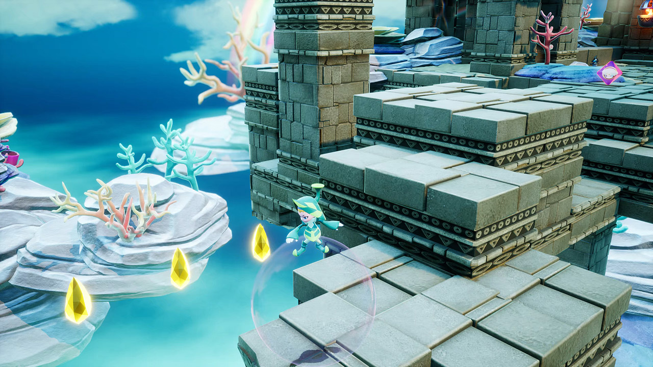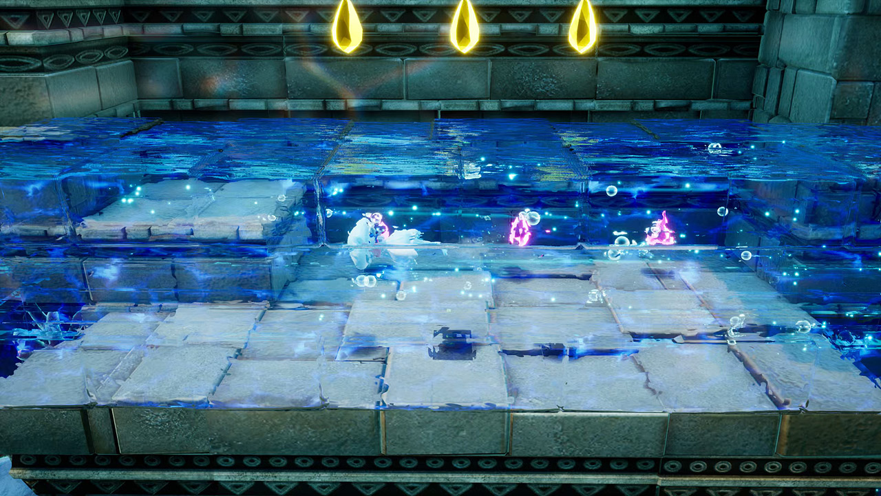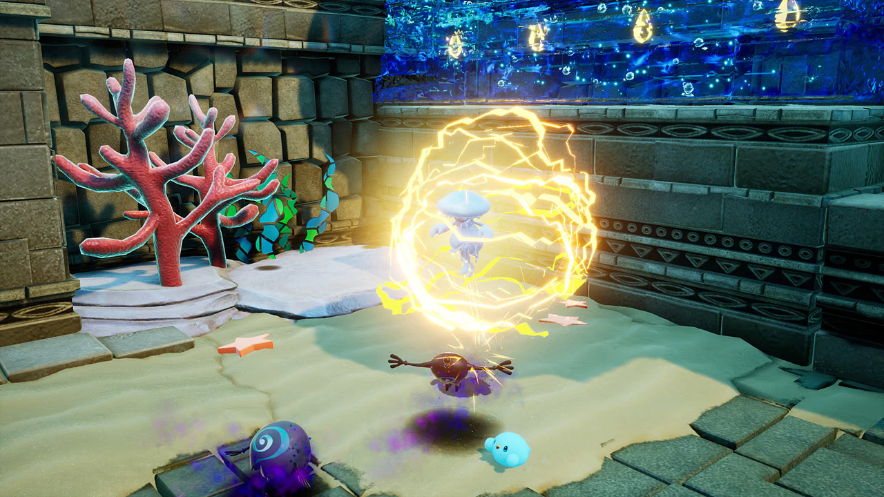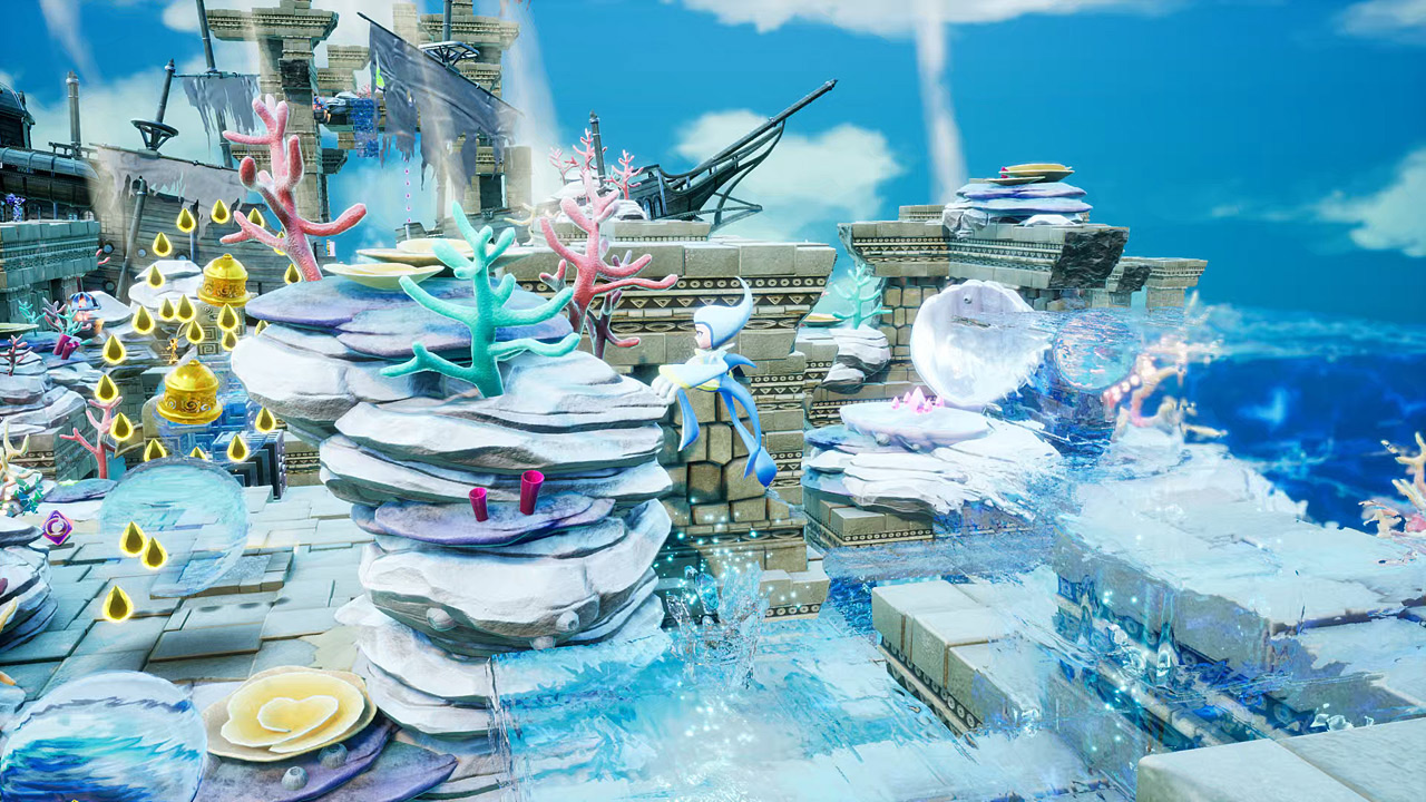 Die Kostüme in Kapitel 2 haben natürlich ebenfalls eine Wasser-Thematik. Dank Dynamischer Delfin kann man Strömungen für hohe Sprünge nutzen, mit dem Quallenkostüm kann man durch Strömungen schwimmen sowie Gegner elektrisieren, als Telepotier kann man sich passenderweise teleportieren, der Doppelspringer tut genau das, was sein Name sagt, und als Blasenblaser gleitet man sanft auf einer Blase.