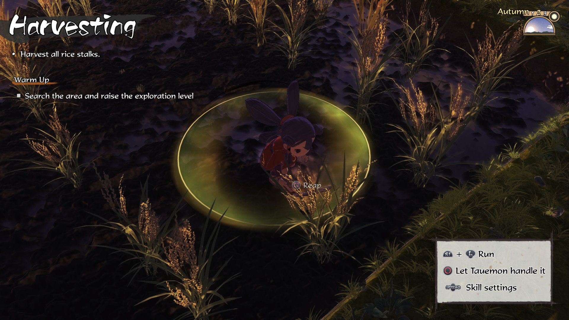 Durch ständiges Absolvieren der Minispiele verbessert ihr eure Anbaufertigkeiten und werdet mit der Zeit deutlich effektiver. Habt ihr allerdings so gar keine Lust, könnt ihr die Aufgaben auch an eure Mitstreiter abgeben. Letzteres führt allerdings zu der genannten Bestrafung. Übergebt ihr die Aufgabe an die KI, schludert diese den Arbeitsschritt für euch fertig. Damit verschlechtert sich die Gesamtqualität des Reises, was mit einem geringeren Anstieg eurer Charakterwerte einhergehen kann. Vielleicht hilft hier ein Beispiel, die Situation zu verdeutlichen. Nehmen wir hierfür den Vorgang des Bepflanzen des Feldes.