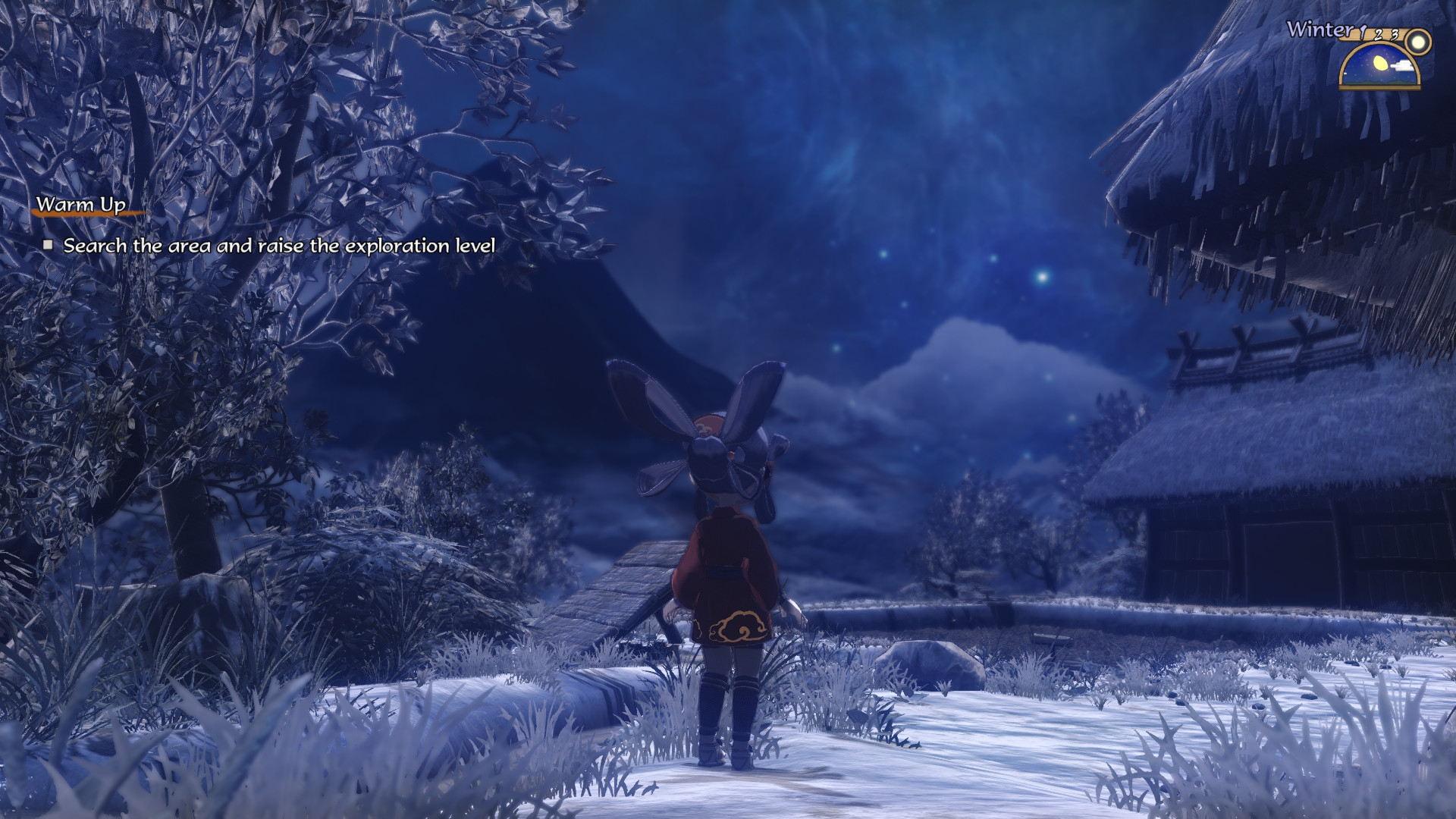 Der Wechsel der Jahreszeiten spielt beim Erkunden keine wirkliche Rolle, die Tageszeit hingegen schon. Macht ihr euch zum Beispiel in der Nacht auf den Weg in die einzelnen von Monstern behausten Areale, könnte euch gerade zu Anfang Übles blühen. Nachts sind bekanntlich alle Katzen grau. So ist eure Sicht anfangs quasi nicht existent. Überdies schlagen auch eure Gegner nachts deutlich härter zu als tagsüber. Dies gilt es beim Erkunden zu beachten. Gerade bei den etwas weitläufigeren Arealen sollte man die Tageszeit im Auge behalten, sonst geschieht es, dass ihr plötzlich in tiefer Dunkelheit einem Kapitelboss gegenübersteht. Um euch dabei etwas entgegenzukommen, sind gerade die längeren Abschnitte durch clever gesetzte Rückzugspunkte (Teleporter) etwas entschlackt. Diese führen euch zurück auf die Oberweltkarte und bieten die Möglichkeit, an der gleichen Stelle wieder einzusteigen.