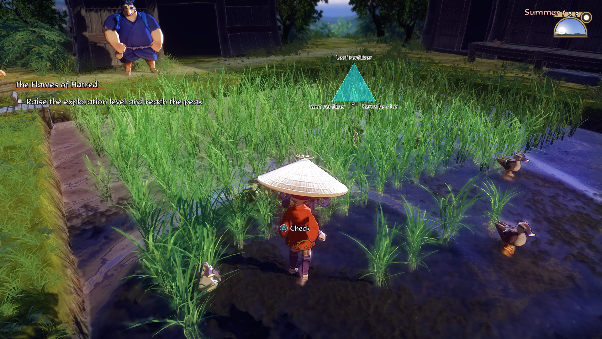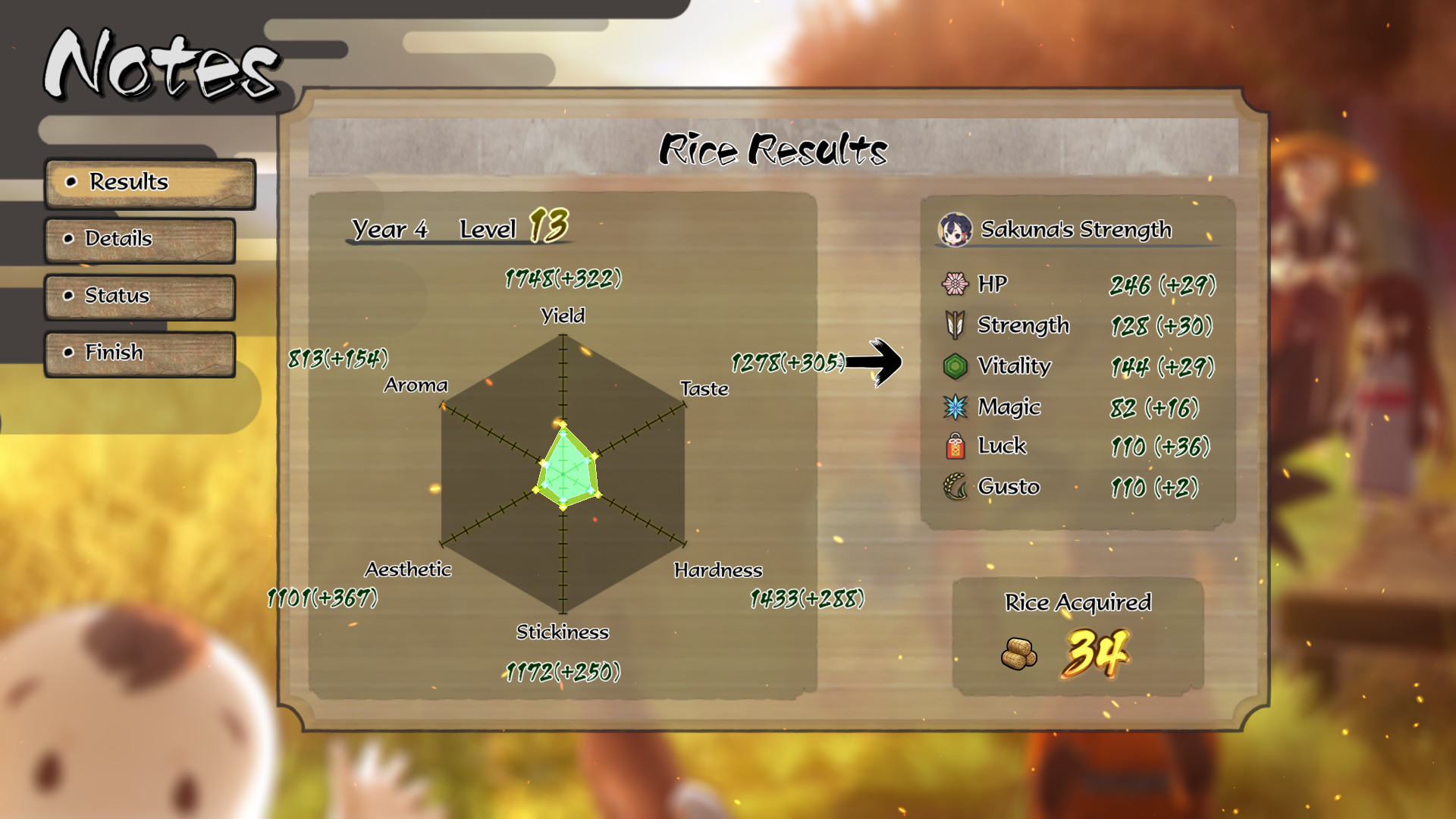 Das Spiel macht es euch dabei nicht gerade einfach, eine gute Ernte einzufahren. Gerade zu Anfang stochert ihr mehr oder weniger im Dunklen. Habt ihr die Abstände der Setzlinge richtig gewählt? Ist der Dünger richtig eingestellt und wieso wird der Reis von Krankheiten und Insekten befallen? Vieles davon löst sich erst mit der Zeit und mittels gefundener Schriften zum Reisanbau. Auch die Anbauschritte und zusätzliche Hilfen erweitern sich mit dem Voranschreiten der Geschichte.
