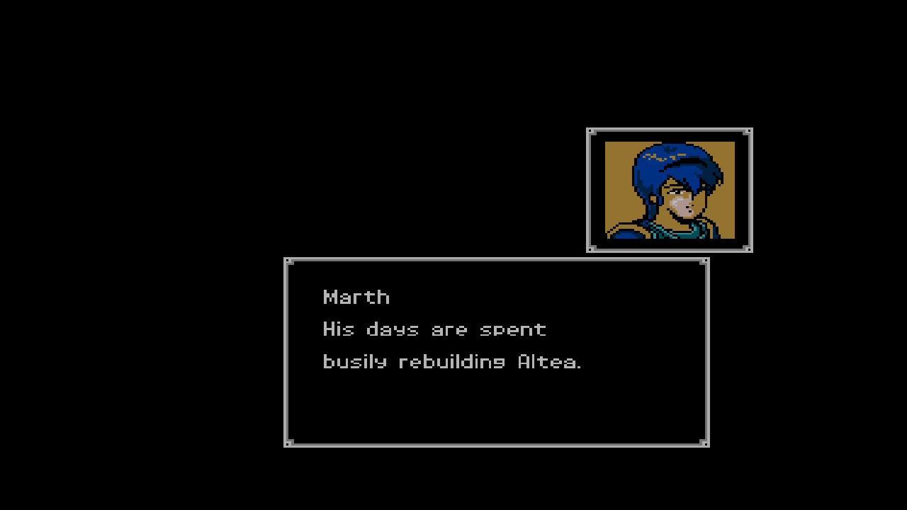 So negativ dies im ersten Moment klingen mag, ist das kein wirkliches Problem. Das erste Fire Emblem sticht nun mal nicht durch seine extrem spannende oder tiefgreifende Story hervor, aber das will es auch nicht wirklich. Die Story wird nämlich in wenigen Textboxen vor den jeweiligen Missionen erzählt und nimmt viel weniger Platz ein als in den späteren Spielen. Deswegen hat es mich am Ende auch sehr überrascht, dass das Schicksal der Charaktere wie bei den Nachfolgern auch hier bereits geschildert wurde. Pro Charakter gab es jeweils einen bis zwei Sätze, die nochmals seinen Werdegang nach dem Spiel erläutert haben. Diese wirken jedoch weniger ausgearbeitet als in den Nachfolgern, was sie etwas überflüssig gemacht hat. Vor allem, weil es mehr als 50 spielbare Charaktere gibt, von denen ihr wahrscheinlich knapp die Hälfte wirklich verwenden werdet.