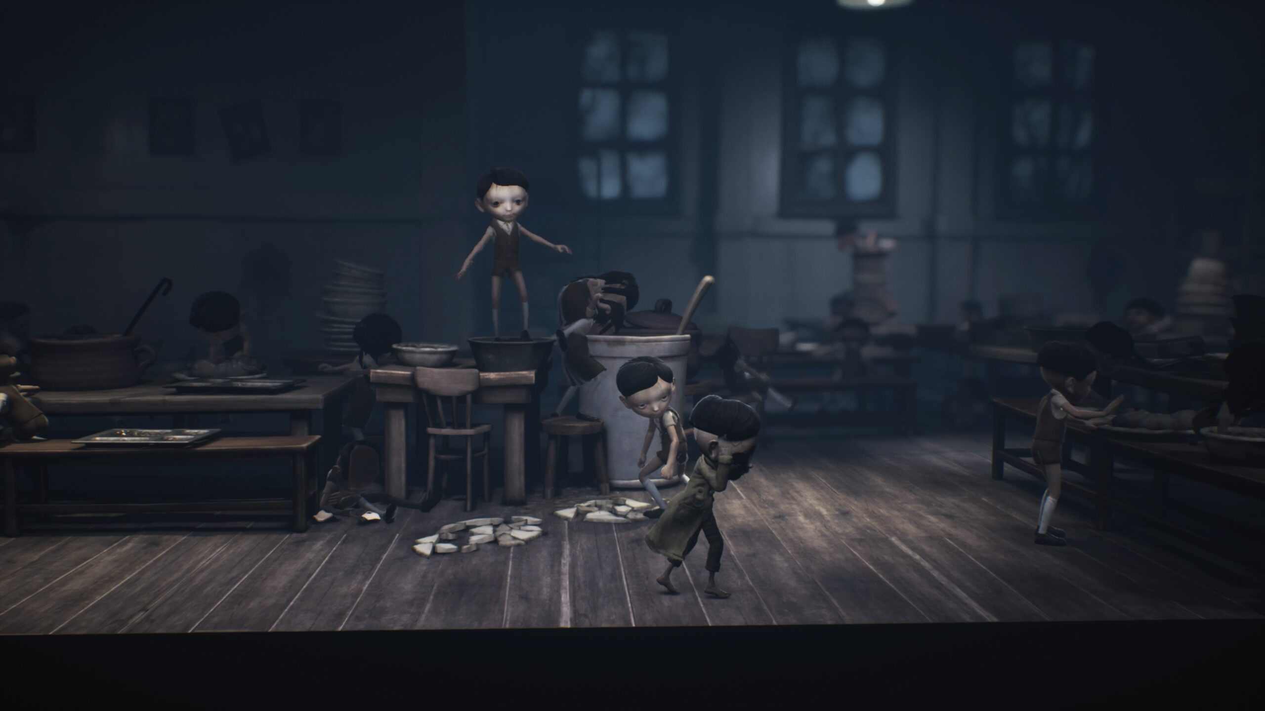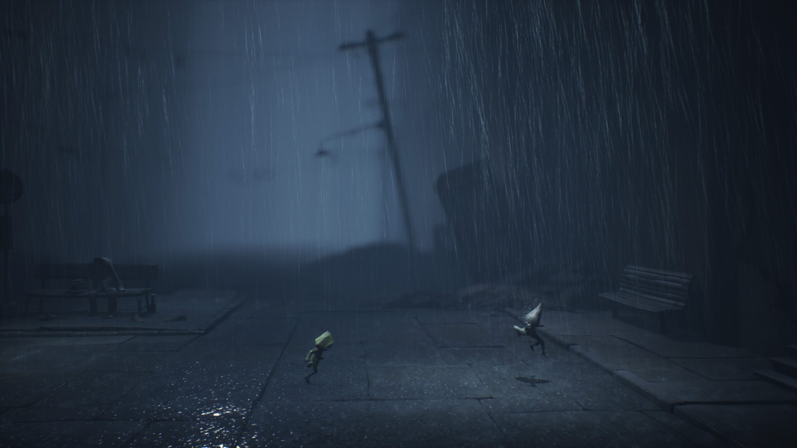Nun aber genug zum Gameplay, da der Atmosphäre des Spiels definitiv auch einige Zeilen gewidmet werden müssen. Diese ist wie beim Vorgänger meiner Meinung nach gelungen – ihr spielt euch mit Mono und Six durch eine düstere, triste Welt, die sich euch trotz ihrer Bizarrerie und fehlenden Logik glaubhaft präsentiert. Untermalt wird dies durch die sanften, melancholischen Klänge des Soundtracks und die einzigartig düstere Grafik. Nach dem anfänglichen Waldgebiet spielt sich das ganze Geschehen in einer regnerischen Stadt ab, in der es in verschiedene Häuslichkeiten geht. Der anfangs erwähnte Signalturm beeinflusst unter anderem die Fernseher der Stadt, welche deren Bewohner süchtig gemacht haben. Die leer starrenden Leute empfand ich hier als interessantes, gesellschaftskritisches Bild.