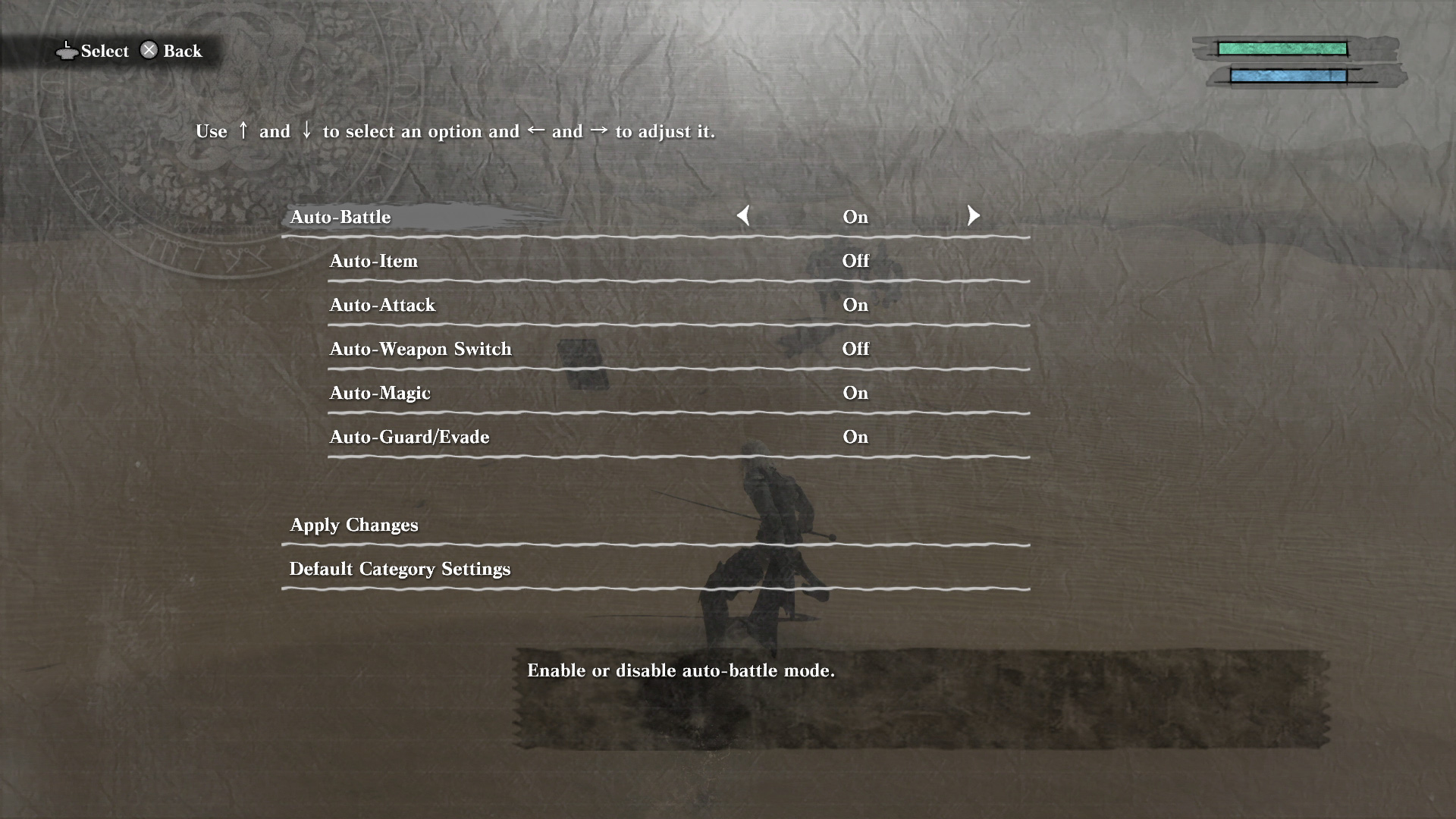 Im Verlauf des Spiels gewinnt der Protagonist an diverser Erfahrung. Dies bezieht sich auf neue Magie-Angriffe, aber auch auf die Verwendung von verschiedenen Arten von Waffen. In der ersten Hälfte des Spiels kann Nier nur einhändige Schwerter verwenden, ab der zweiten Hälfte gesellen sich Zweihänder und Speere zum Waffenrepertoire hinzu.