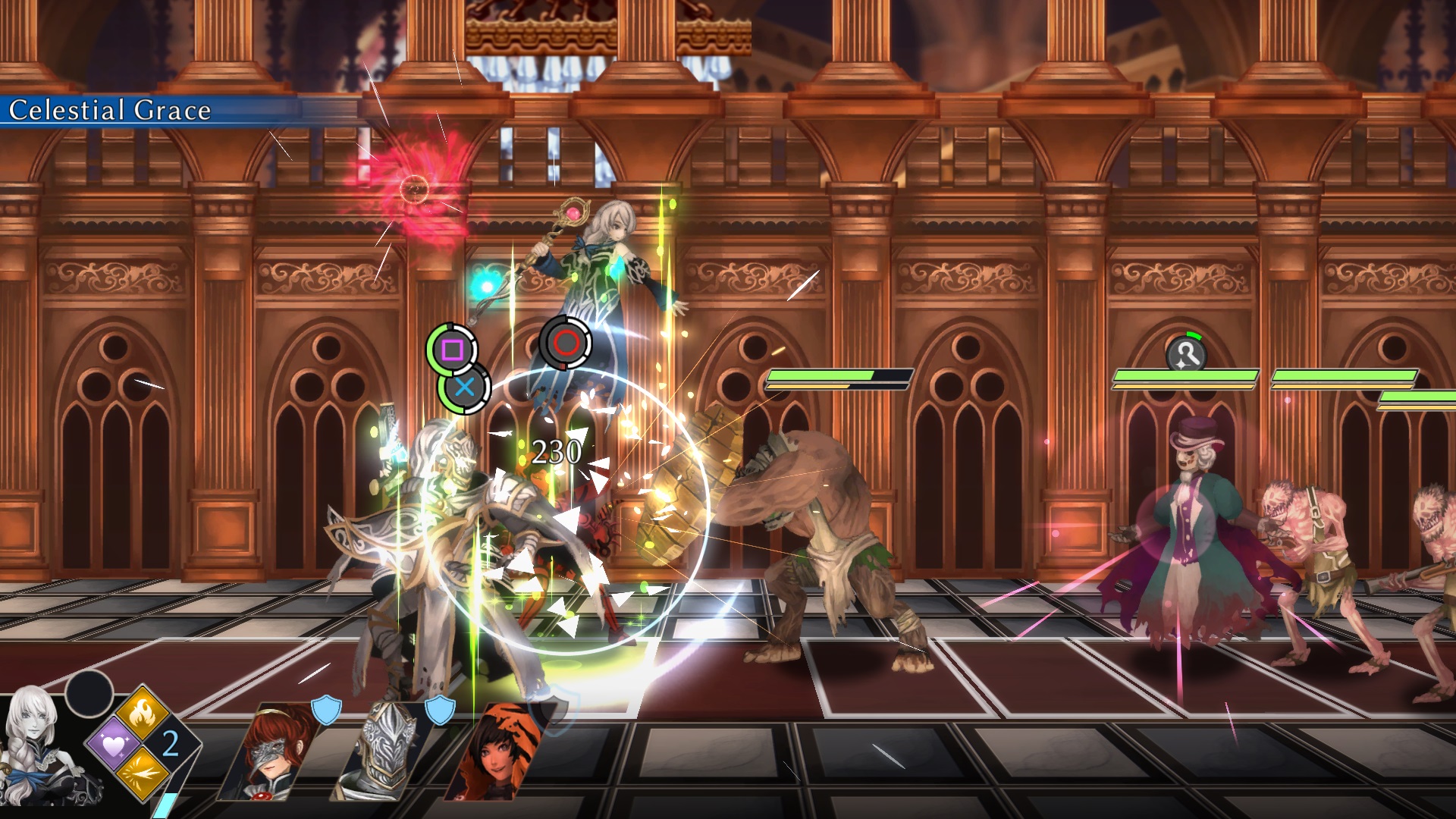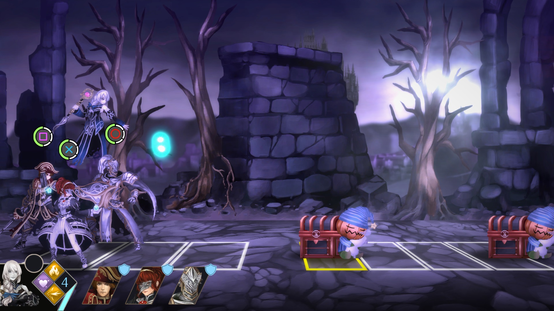 Ihr und eure Gegner seid auf dem Bildschirm geteilt gegenübergestellt und auf einem Raster positioniert. Während sich eure Truppe immer auf einem Feld befindet, können sich die Gegner frei auf den möglichen Feldern verteilen. Ihr hingegen könnt die Aufstellung rotieren lassen, um zum Beispiel eine geschwächte Heldin in die zweite Reihe zu bugsieren.