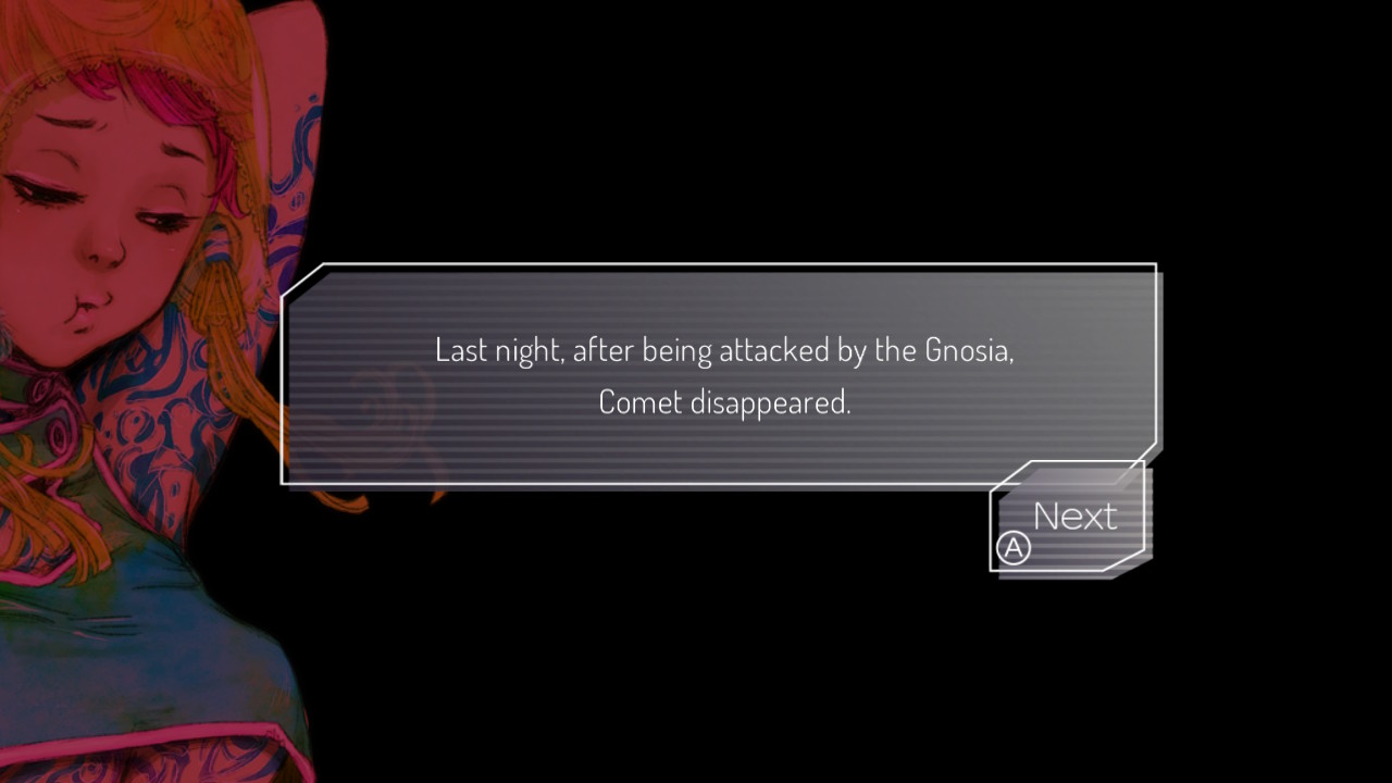 Gnosia besticht nicht nur durch sein interessantes Gameplay-Konzept, sondern besonders durch das visuelle Design. Viele Visual Novels sind zwar für deren künstlerische Darstellung bekannt, aber das sollte nicht davon abhalten, dieses auch in Gnosia überschwänglich zu loben. Der Stil erinnert an ausgefeilte Bleistiftzeichnungen, wie man es meist bei detaillierten Concept Arts sieht, bevor kalte 3D-Modelle darüber gelegt wurden.