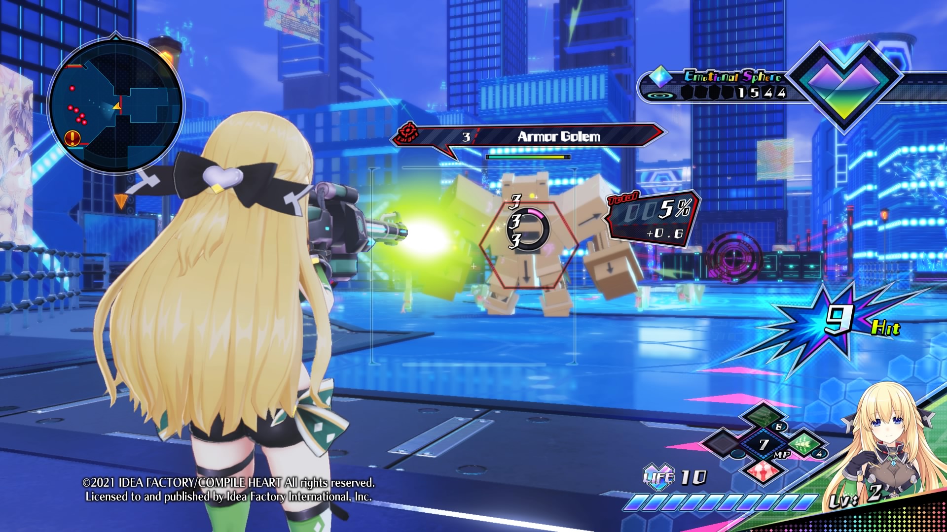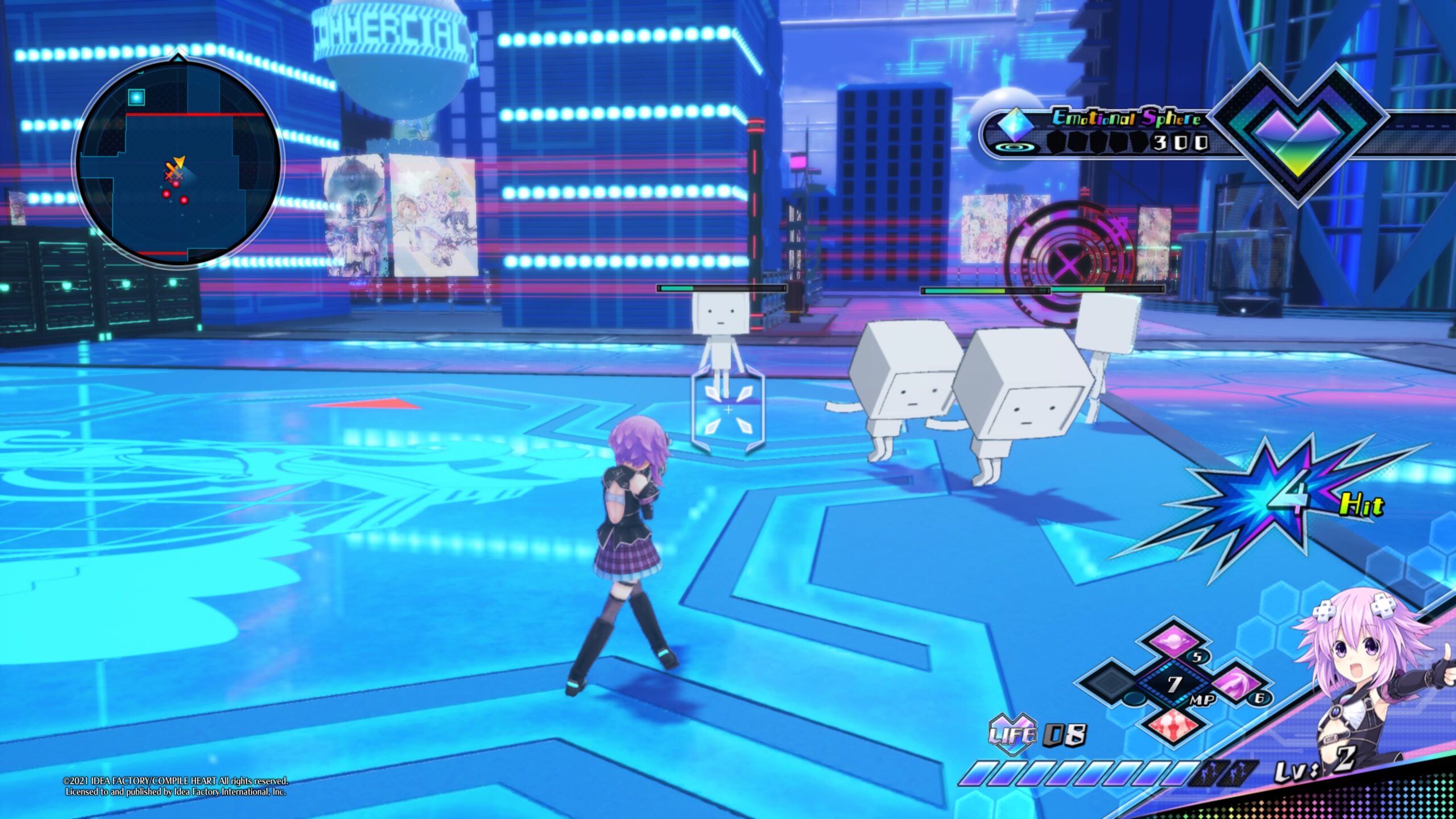 Für VTuber hat man jedoch die Möglichkeit, die Kameraentfernung zum Charakter einzustellen – Göttin sei Dank. Per Knopfdruck metzelt man sich als VTuber durch die Gegner und hat hierbei etwas mehr Kombinationsmöglichkeiten, was normale und Spezialangriffe angeht. Dennoch fällt das Action-Gameplay ziemlich seicht aus, da man nur eine normale Angriffskombo hat und hier und da mal einen Spezialangriff einwerfen kann. Beide Gruppen besitzen noch offensive Fähigkeiten, die man auch auf Knopfdruck aktivieren kann, die allerdings MP kosten.