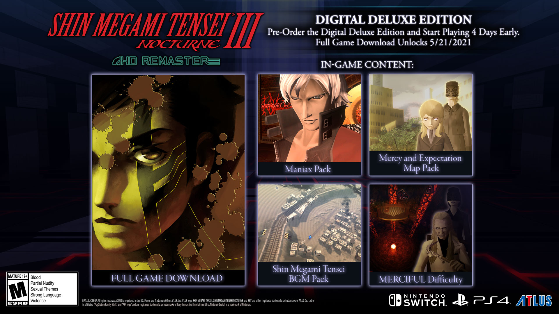 Eine Handelsversion zu Shin Megami Tensei III: Nocturne HD Remaster für Konsolen wird es ebenso geben wie eine Digital Deluxe Edition mit zahlreichen digitalen Bonusinhalten. Dazu zählen das „Maniax Pak“ (mit Dante aus Devil May Cry) und das Chronicle Pack (mit Raidou aus Devil Summoner). Ebenso gibt es den zusätzlichen Schwierigkeitsgrad „Merciful“ und einige weitere Background-Musiktracks. In Japan wird es zusätzlich eine Limited Edition geben.