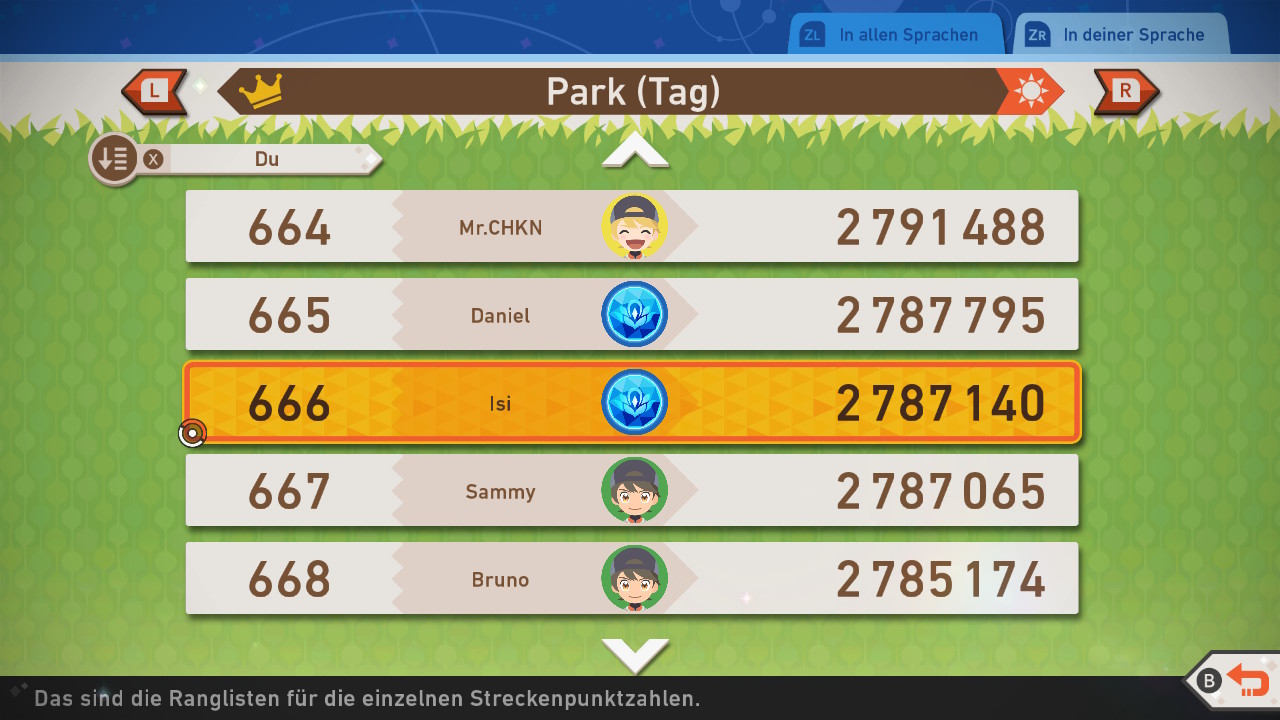 Meine anfängliche Sorge wegen Spoilern vergeht direkt, als ich ein verdecktes Bild sehe. Wenn ich es auswähle, sagt mir das Spiel, dass sich dahinter ein noch nicht entdecktes Pokémon verbirgt und fragt, ob ich es wirklich sehen möchte. Dieses kleine Detail finde ich sehr gelungen, da ich so die Erlebnisse anderer Spieler sehen kann, ohne dass mein eigenes Erlebnis eventuell negativ beeinflusst wird. Es gibt sogar eine Rangliste, in der man die erspielten Punktzahlen der anderen einsehen kann. Das spornt zusätzlich dazu an, nach den perfekten Fotos zu jagen, um sich oben auf der Rangliste zu platzieren.