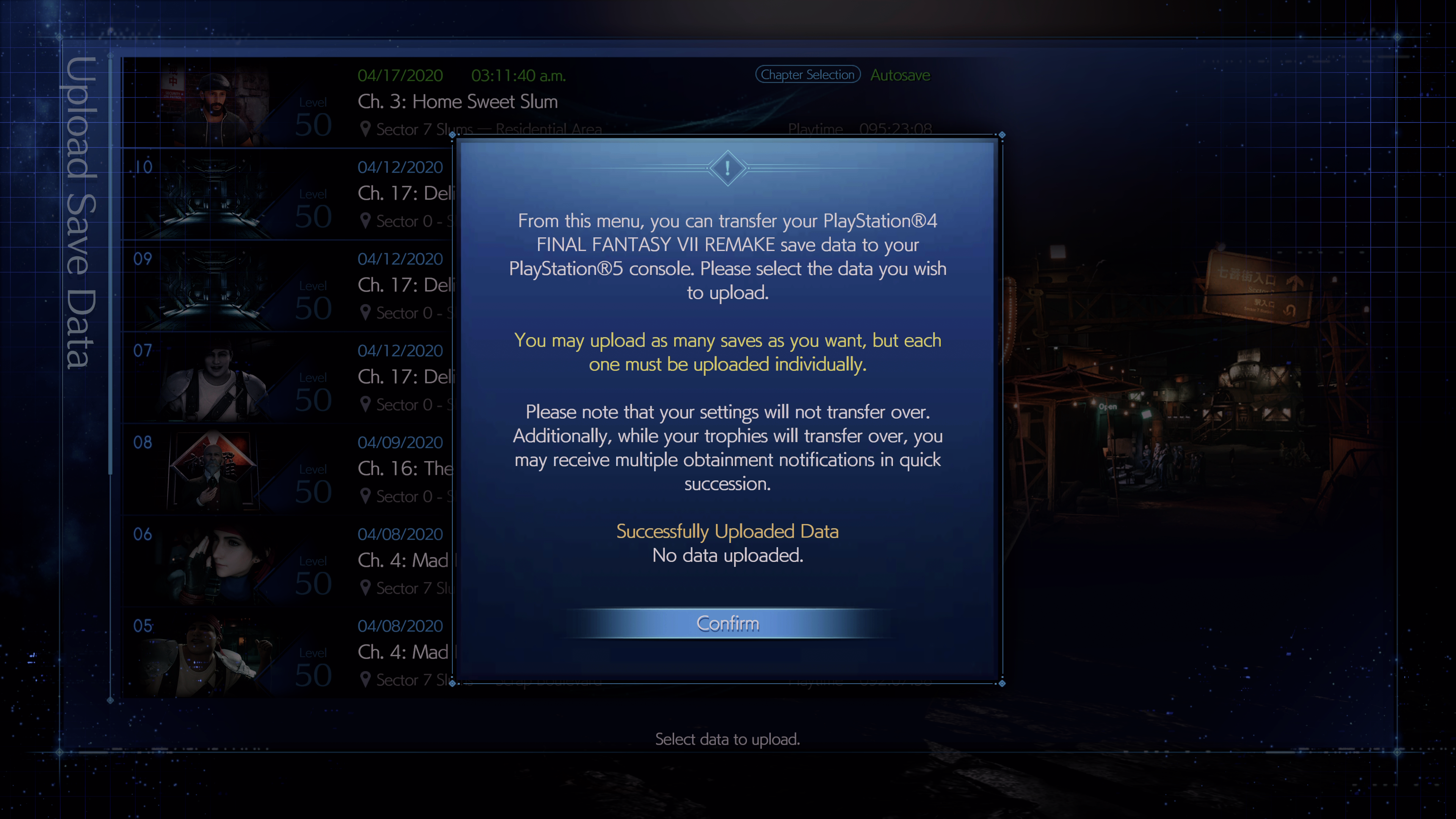 Ihr könnt euren Speicherstand von eurer PS4-Konsole aus hochladen, aber natürlich auch den Speicherstand des PS4-Spiels auf eurer PS5-Konsole. Auch diesen könnt ihr dann in Final Fantasy VII Remake Intergrade* importieren. Ihr könnt unbegrenzt Speicherstände hochladen, müsst das aber für jeden Spielstand einzeln wiederholen.