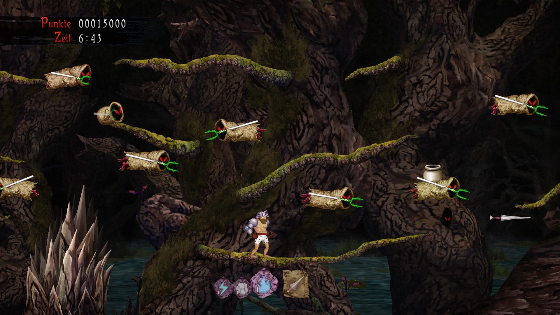 Auch findet man nach kniffligen Passagen ein kleines Checkpoint-Fähnchen, was man nach dem Ableben Arthurs als neuen Anfangspunkt auswählen kann. Schön, dass diese Option nicht die standardmäßig ausgewählte ist und man diese erst manuell auswählen muss. Drückt man nämlich einmal zu schnell weiter, so darf man den ganzen Abschnitt noch einmal machen. Das ist kein Fehler im Spiel, denn ich bin mir hier absolut sicher, dass die Entwickler gerade in diesem Moment den größten Spaß ihres Lebens haben.