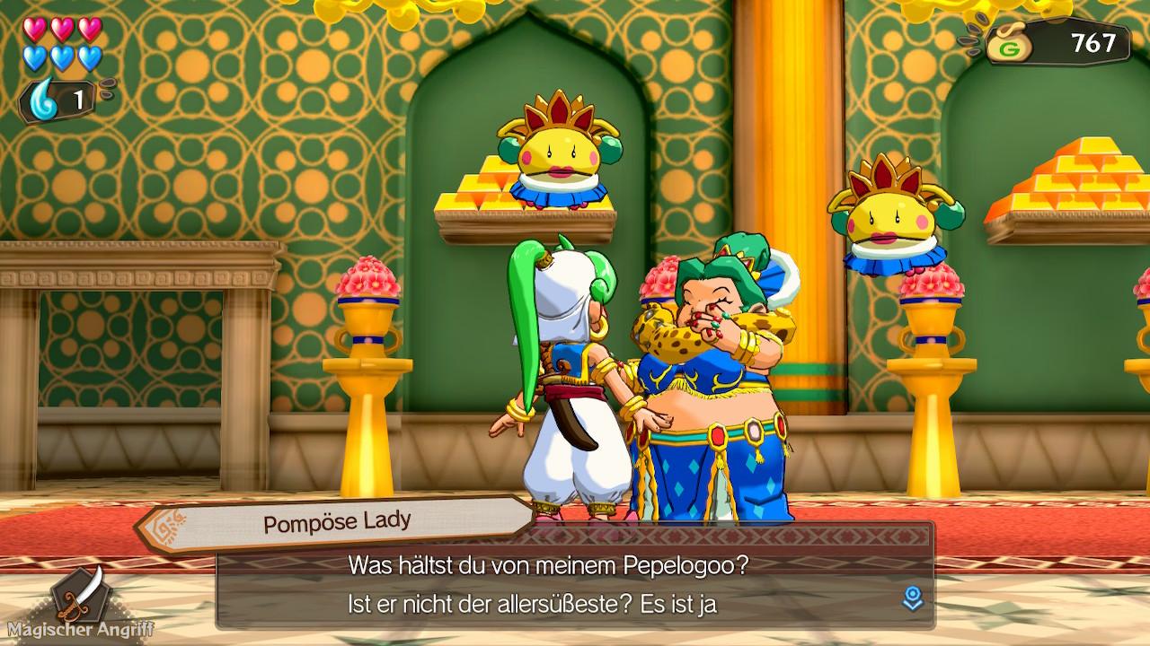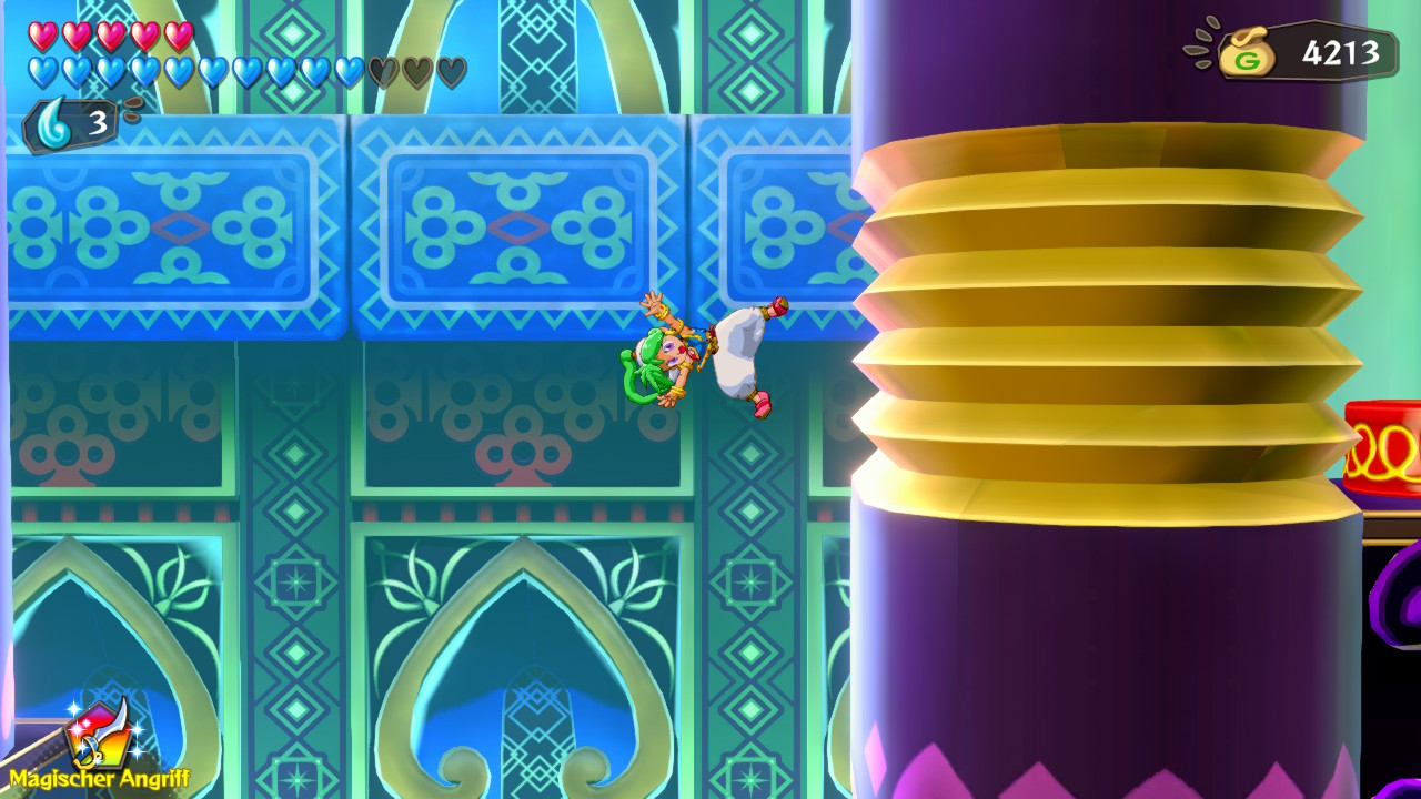 Neben den angesprochenen blauen Herzen, die sich durch gesammelte Tropfen aufbessern lassen, hat Asha auch rote Herzen. Diese lassen sich durch Accessoires steigern, die ihren Preis haben und die ihr mit dem in Dungeons gesammelten Gold bezahlen könnt. Also fehlen hier auch die heute oft bekannten RPG-Elemente zur Verbesserung. Da es nicht allzu viele dieser Gegenstände gibt, könnt ihr jede Verbesserung spüren. Im Allgemeinen ist Wonder Boy: Asha in Monster World kein allzu schweres Spiel und vor allem die Bosse könnt ihr meistens ohne eine größere Taktik mit stumpfem Draufhauen besiegen.