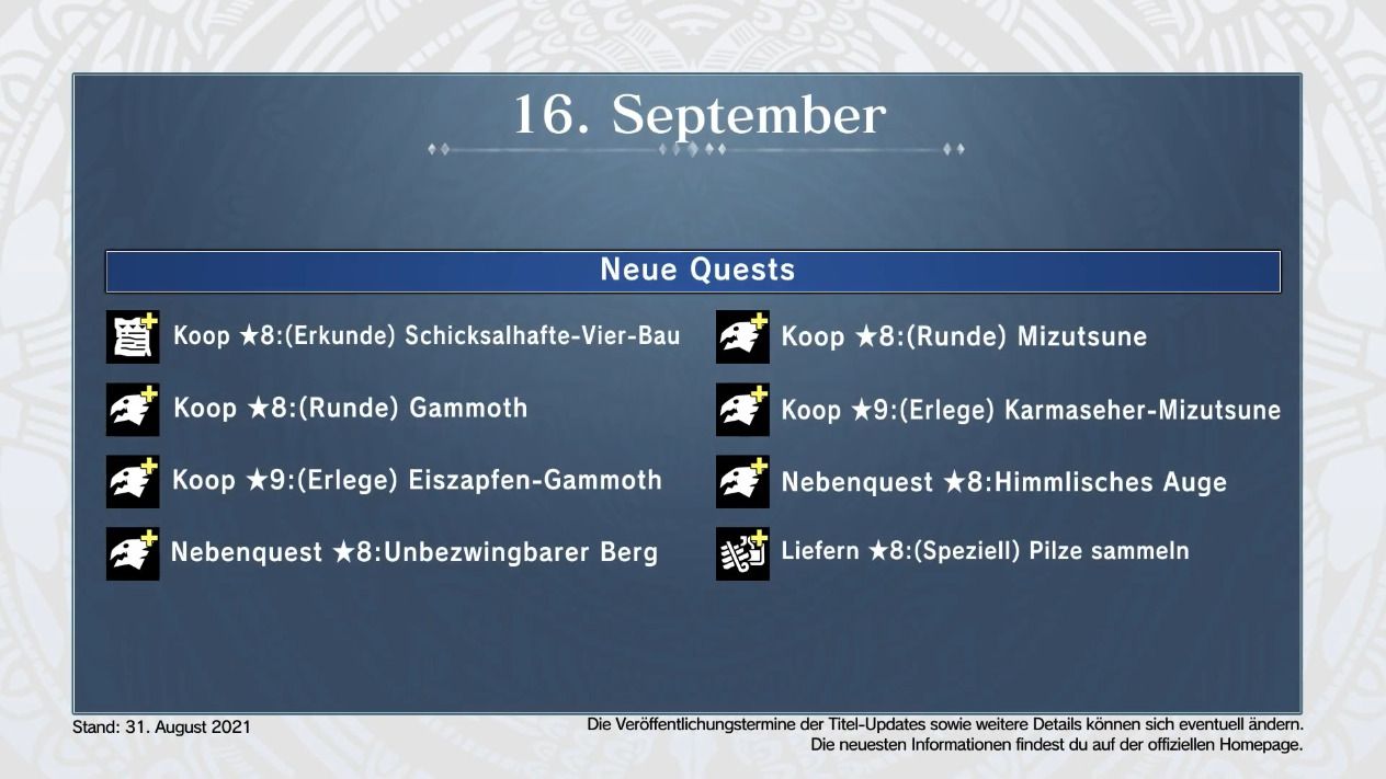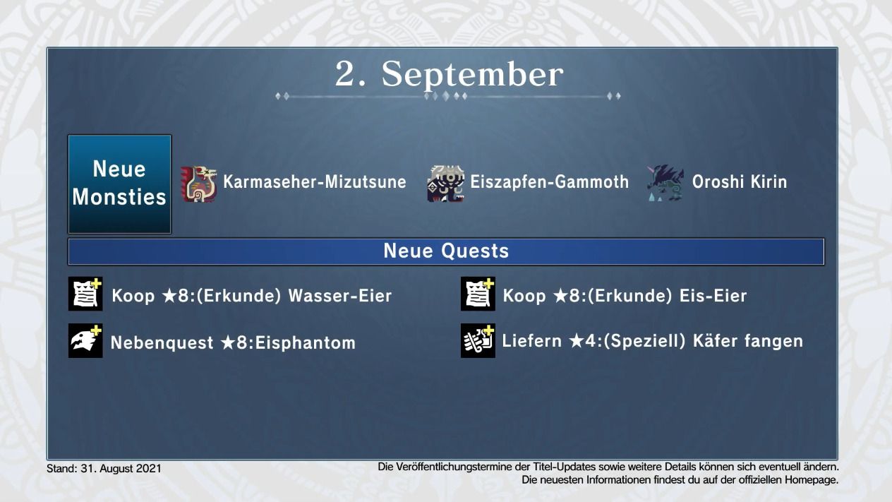 Das Inhaltsupdate ist für den 2. September geplant und wird neben den neuen Monstern – entschuldigt, Monsties – Oroshi Kirin, Karmaseher-Mizutsune und Eiszapfen-Gammoth auch neue Nebenaufgaben und Koop-Quests zugänglich machen. Die Events gehen am 16. September weiter.