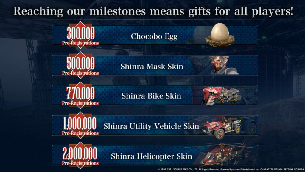 Und immer, wenn man sich bei Mobile-Games vorab registrieren kann, gibt es auch eine Kampagne für erreichte Meilensteine bei der Registrierung. Für 300.000 Registrierungen winkt allen SpielerInnen zum Launch ein kostenloses Chocobo-Ei. Interessant sind die weiteren Ziele, die euch verschiedene Skins und Accessoires in Shinra-Optik bringen.