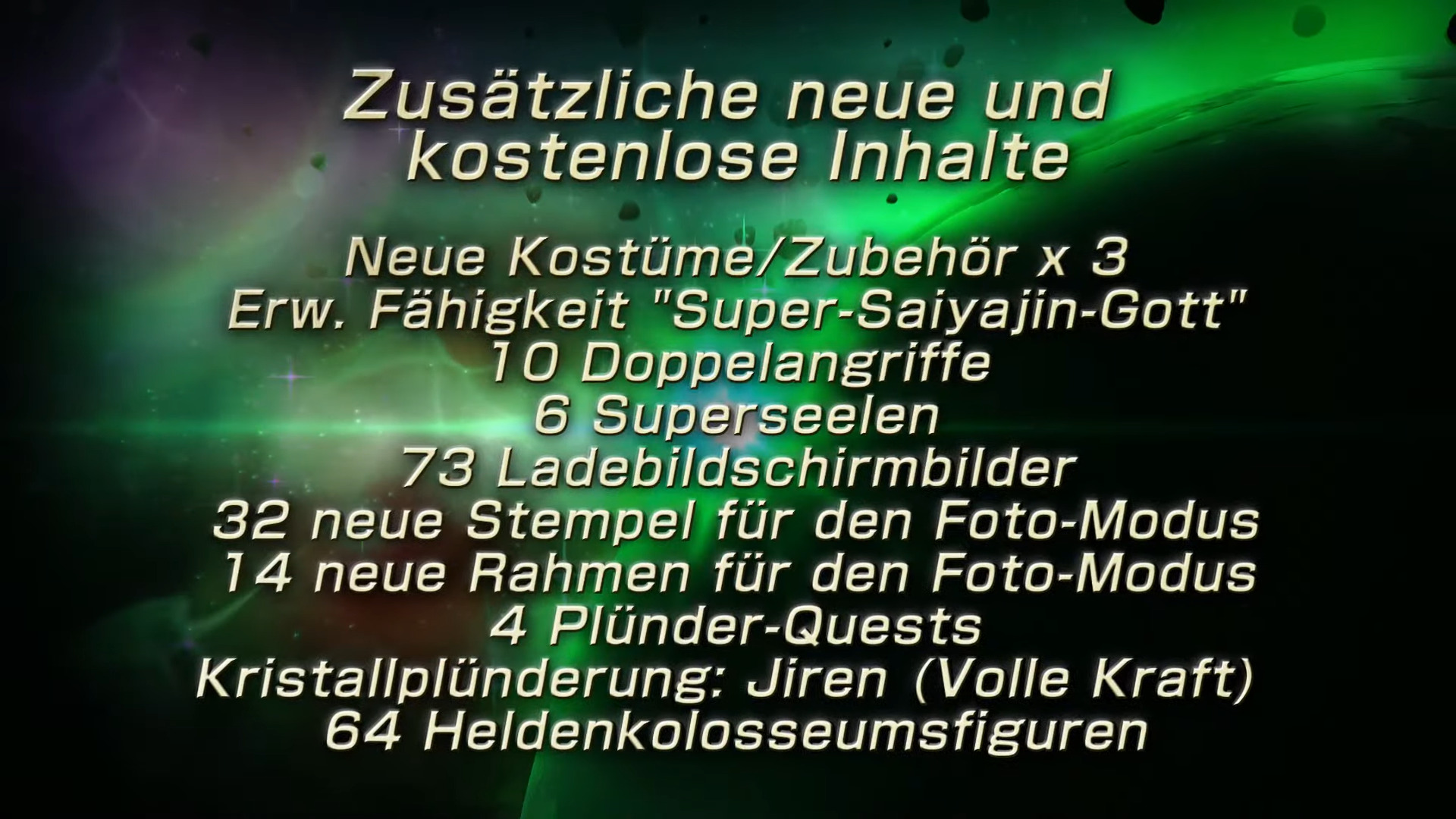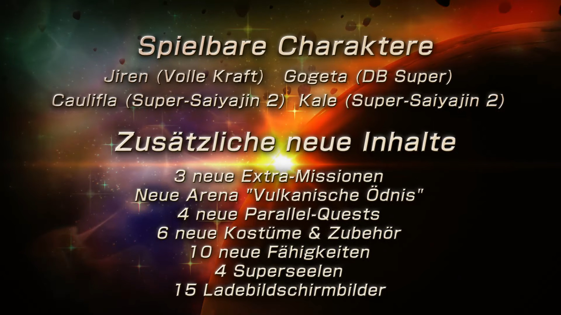 Die weiteren drei Charaktere sind Jiren (Volle Kraft), Gogeta (Dragon Ball Super) und Caulifla (Super-Saiyajin 2). Die weiteren Inhalte des Legendary Pack 2: 3 neue Extra-Missionen, die Arena „Vulkanische Ödnis“, 4 neue Parallel-Quests, 6 neue Kostüme und Zubehör, 10 neue Fähigkeiten, 4 Superseelen und 15 Ladebildschirmbilder. Ein kostenloses Update liefert ebenfalls viele neue Inhalte. Weitere DLCs sollen im nächsten Jahr erscheinen.