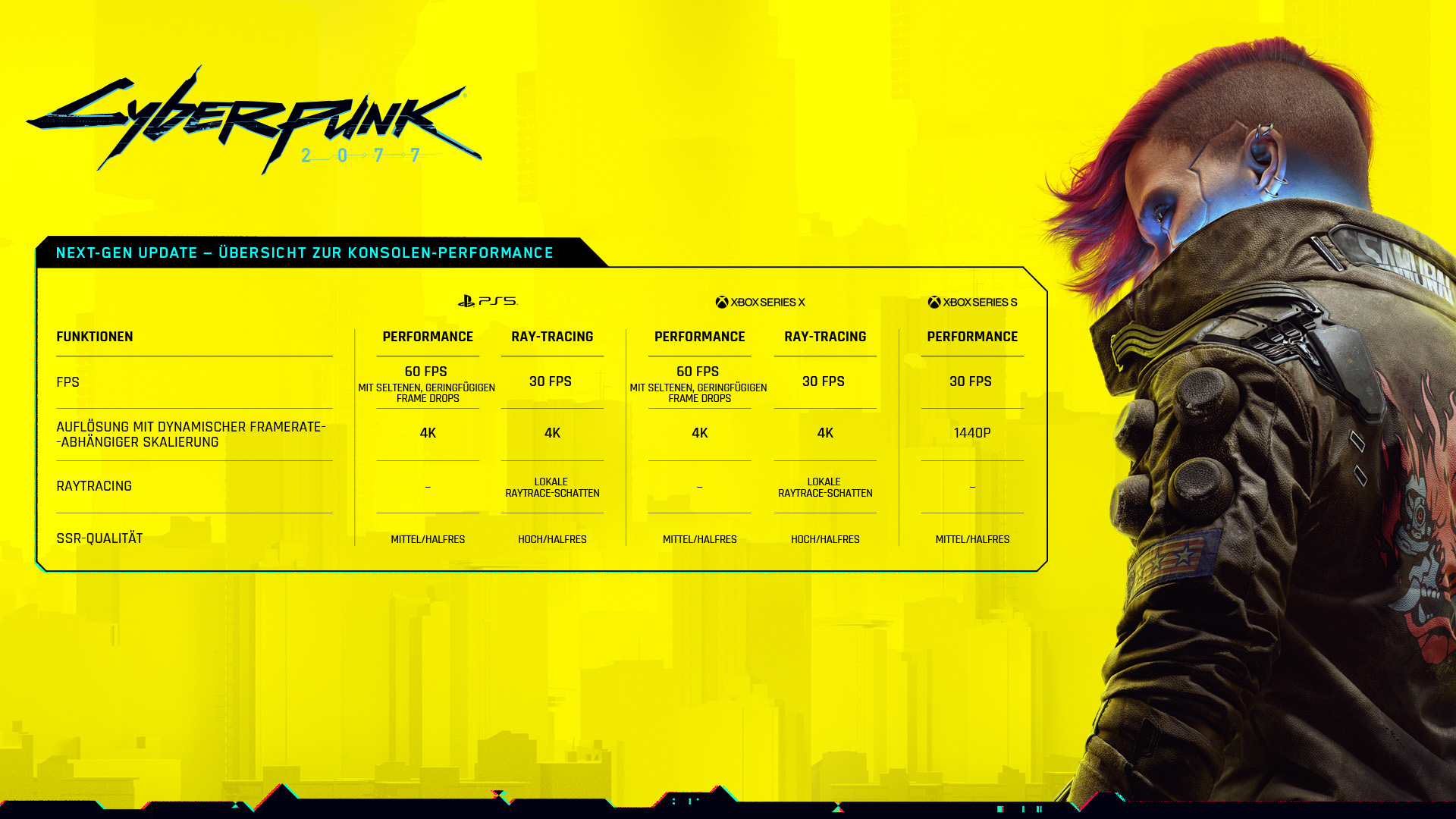 Zwei schöne Schaugrafiken zu neuen Features und Performance seht ihr unten. Die Patch-Notes gibt es auf der offiziellen Website auch deutschsprachig. Darüber hinaus veröffentlichte man eine spielbare Demo für Xbox Series und PS5, in der ihr Cyberpunk 2077 fünf Stunden lang anspielen könnt. Die Testversion wird 30 Tage lang, bis zum 15. März, 17 Uhr MEZ spielbar sein.